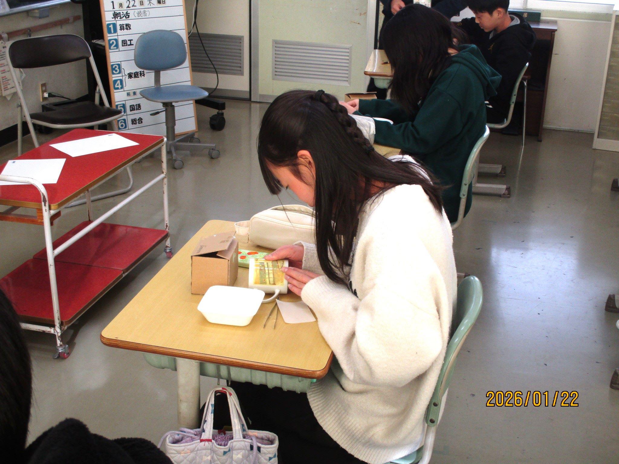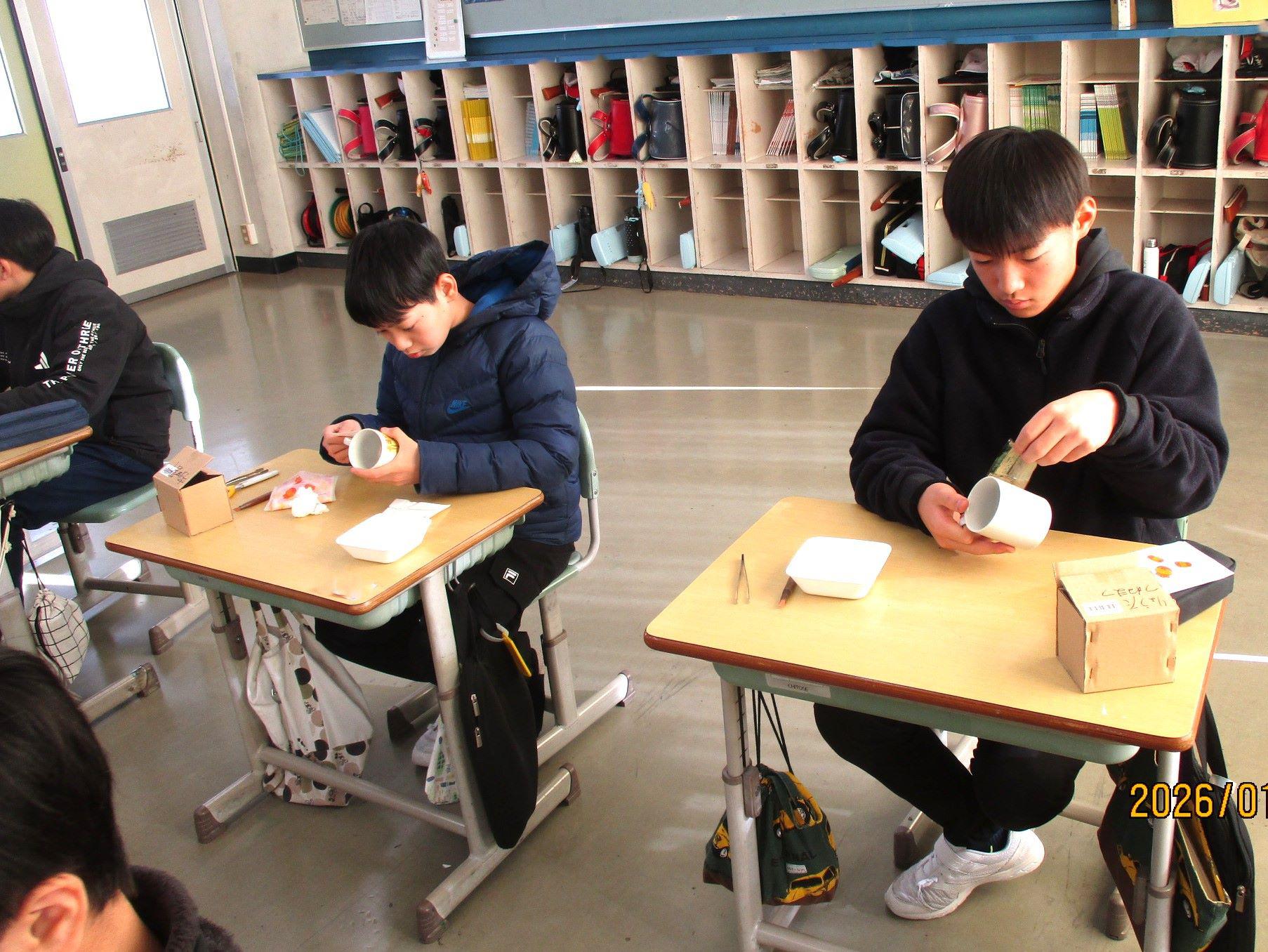 貼った後、ティッシュを使って、優しくシート裏の水を追い出したり吸い取ったりしました。シートを貼り終わったマグカップは、窯で焼いた後、3月に届けてくださるそうです。こどもたちも、出来上がったものが届くのが楽しみのようでした。「だんだんと6年生のこどもたちの卒業が近づいているんだな。」と感じました。