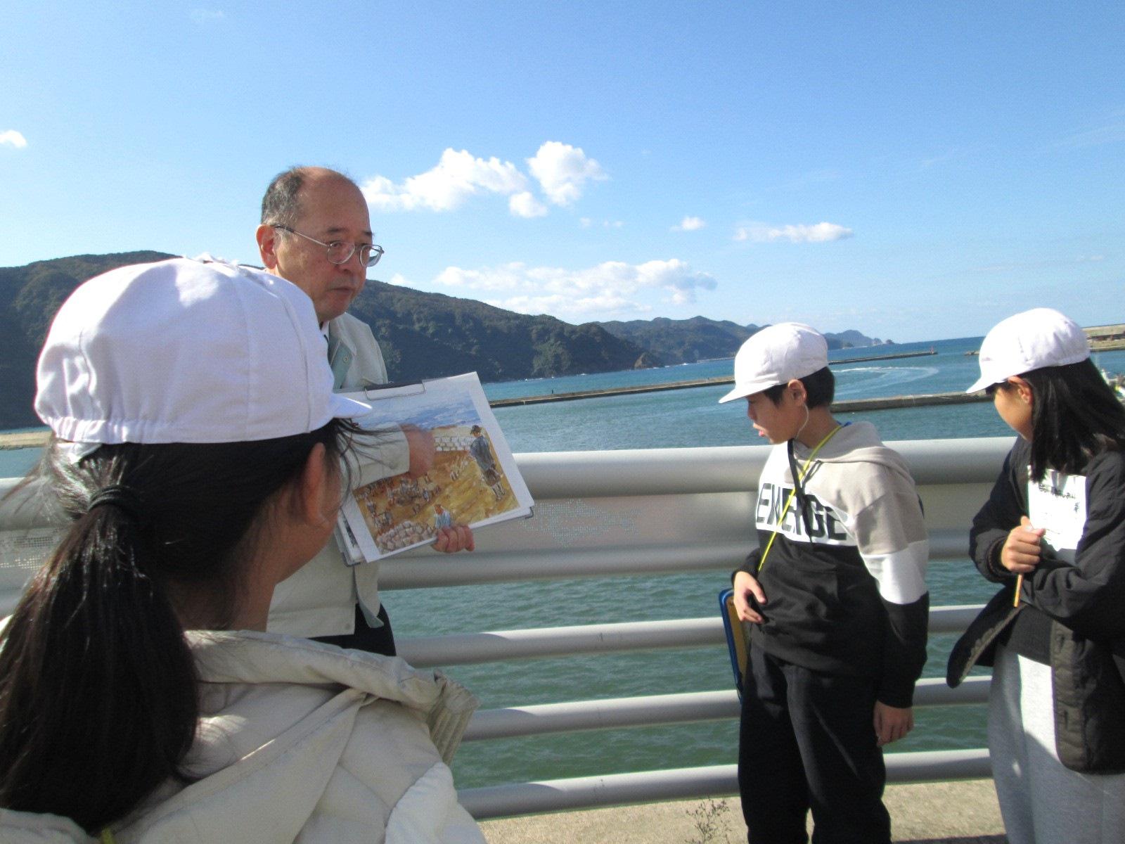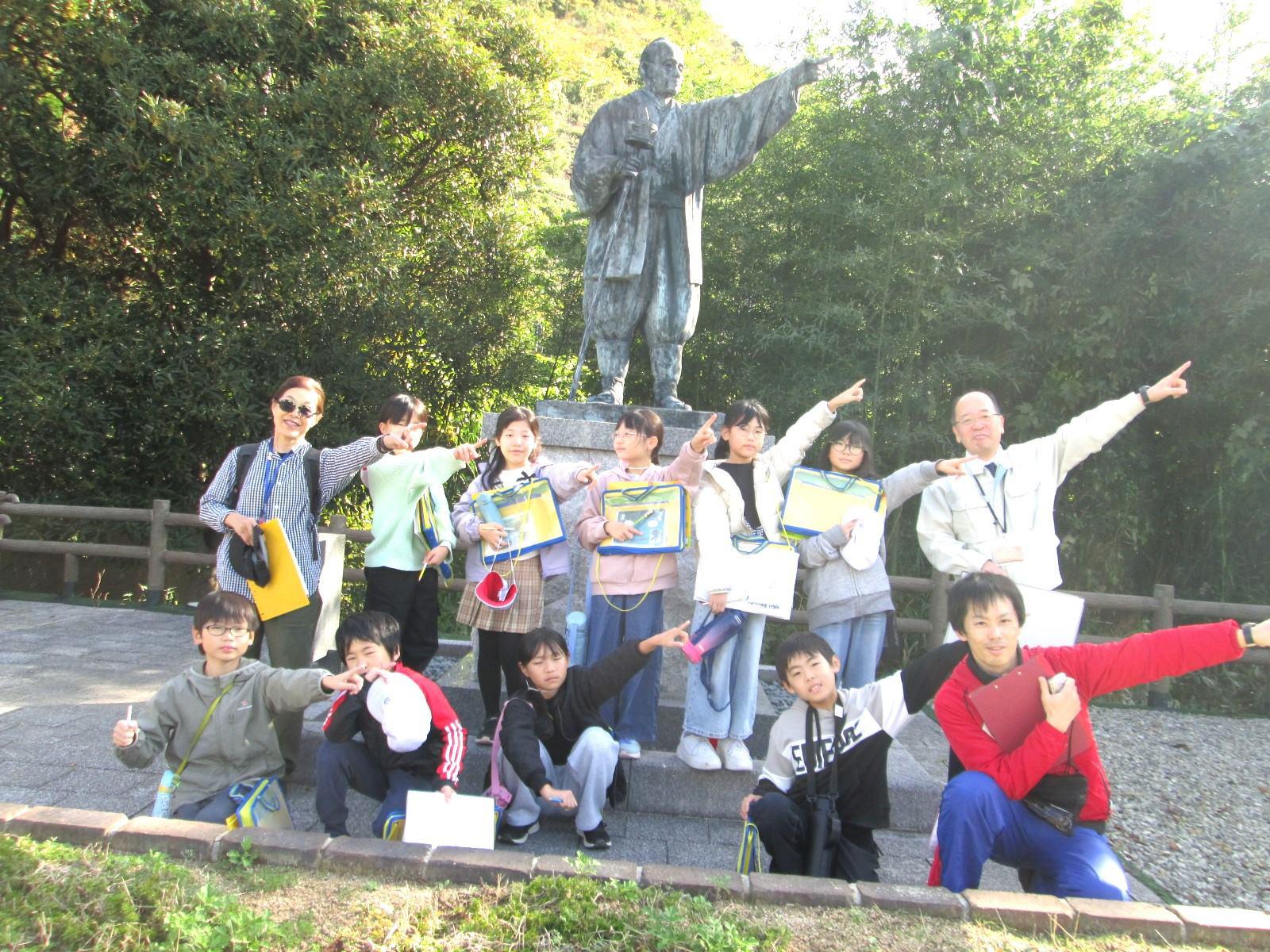 清原太兵衛像の前では、左手で宍道湖を指すポーズを真似て記念撮影。最後に、日本海側の河口である恵曇港までたどり着きました。地域の人々のために尽力した清原太兵衛の苦労や努力について学んだ見学でした。