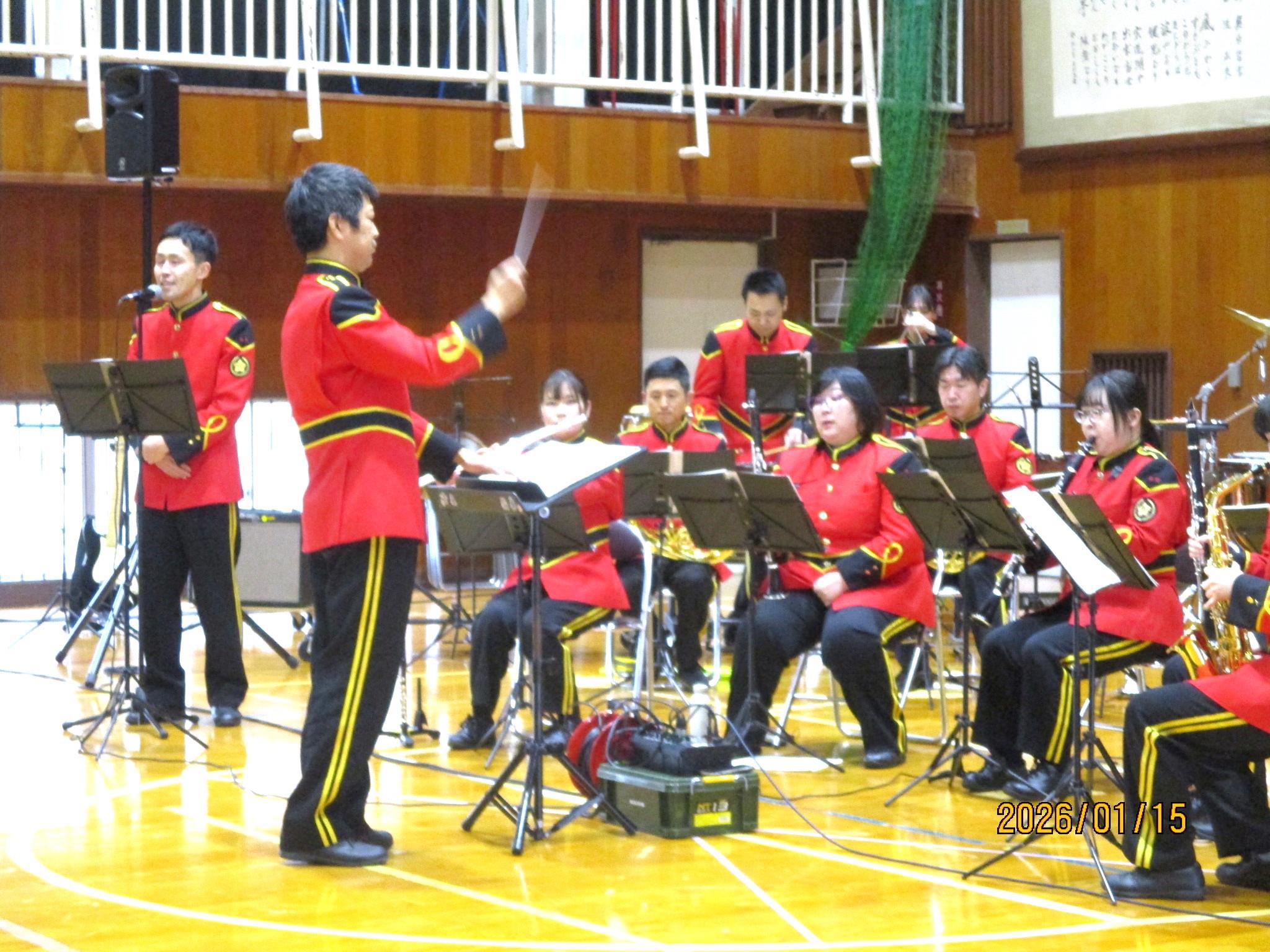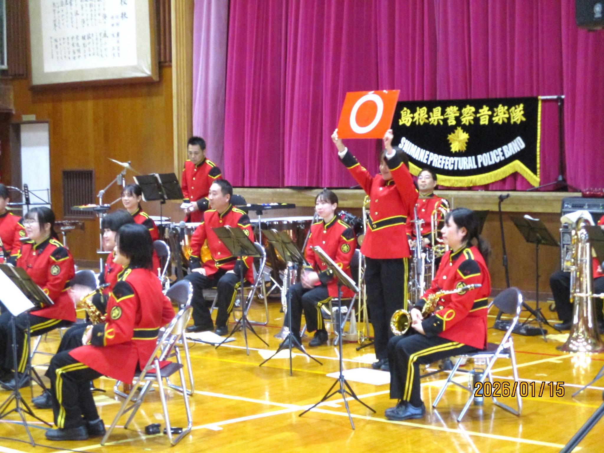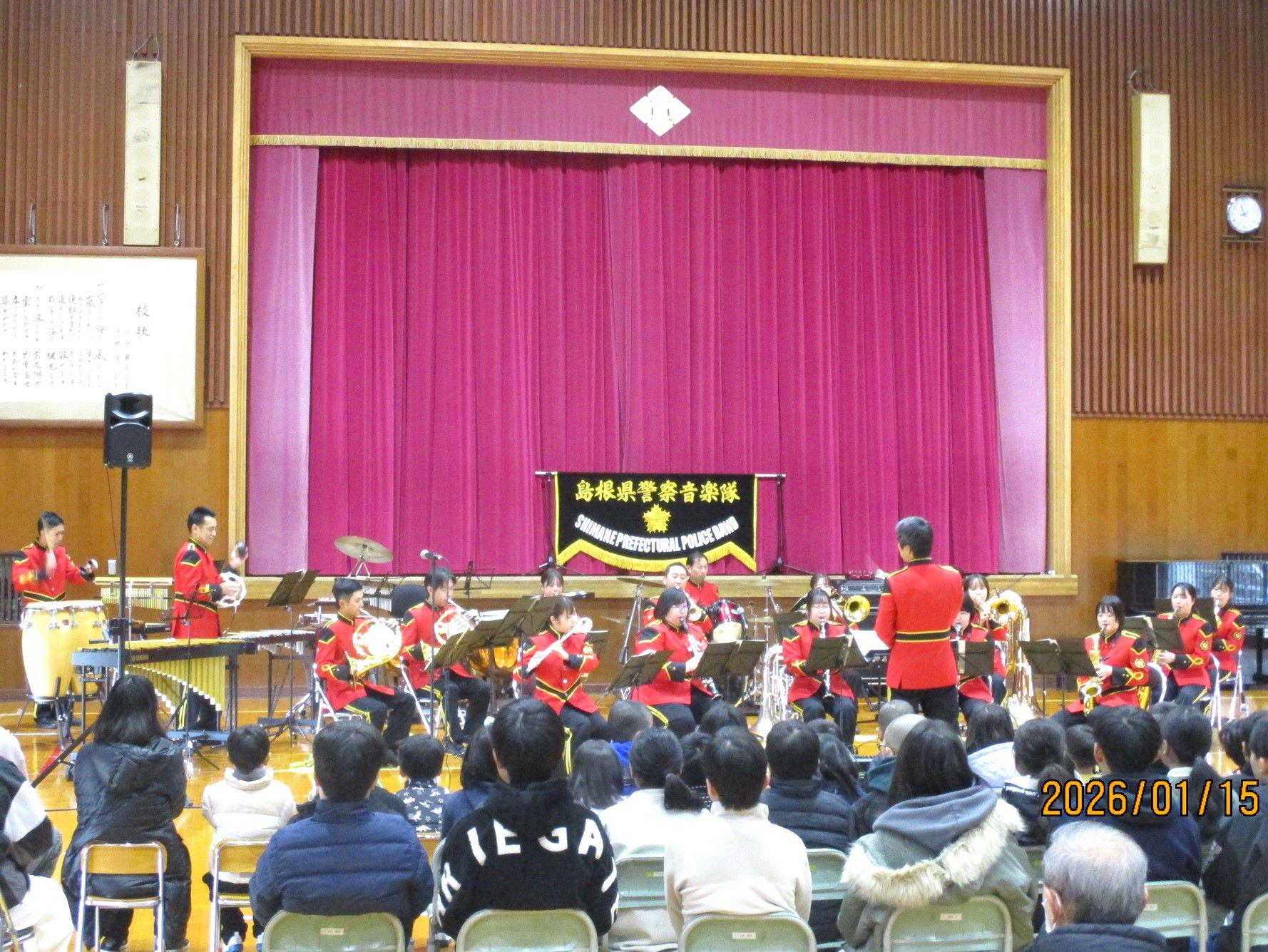 今年度は、島根県警察音楽隊の皆さんの演奏を聴かせていただきました。楽器の紹介から始まり、こどもたちもよく知っているアニメ主題歌の演奏や熱唱ポリスさんの歌などを楽しく鑑賞しました。