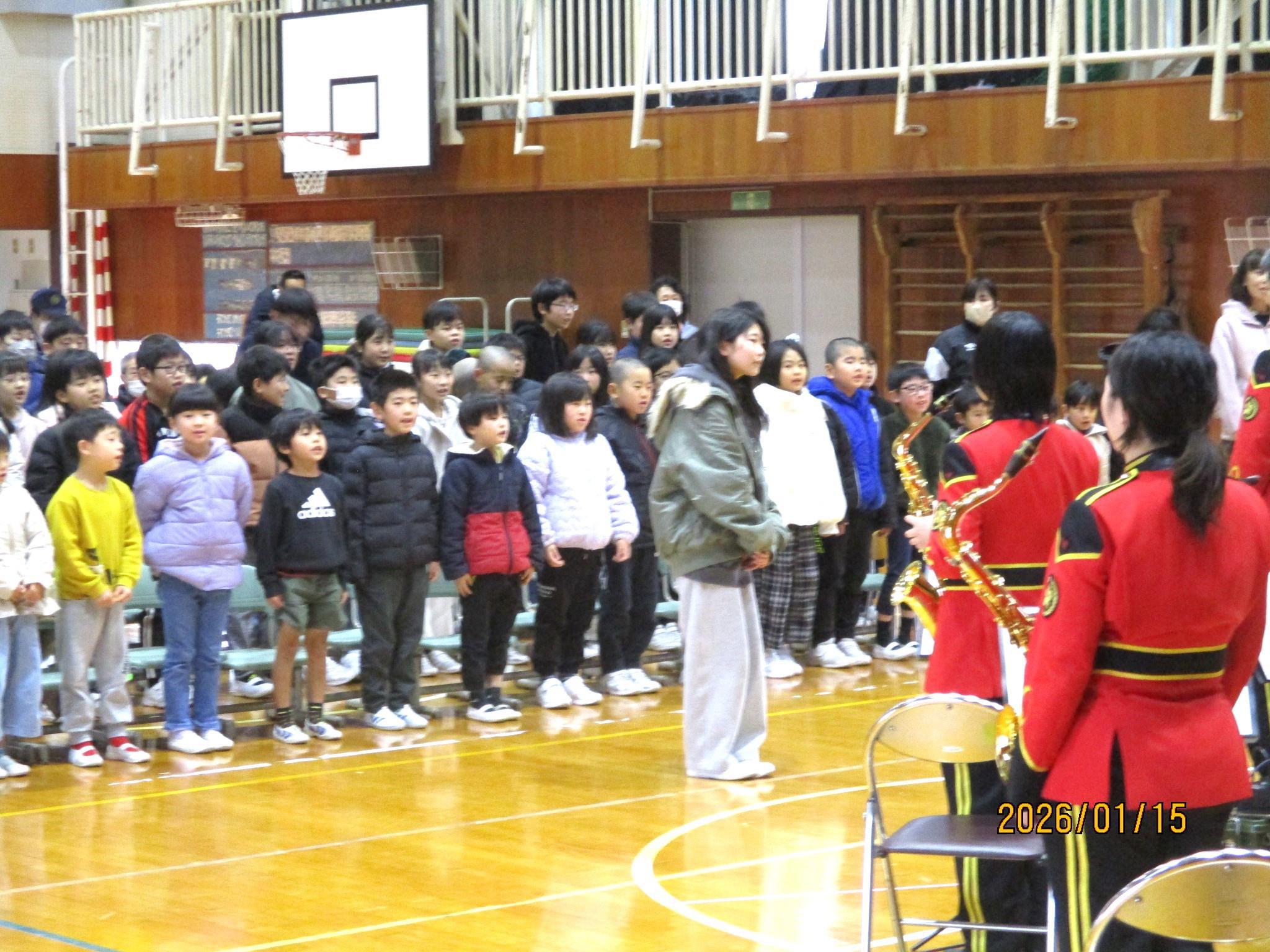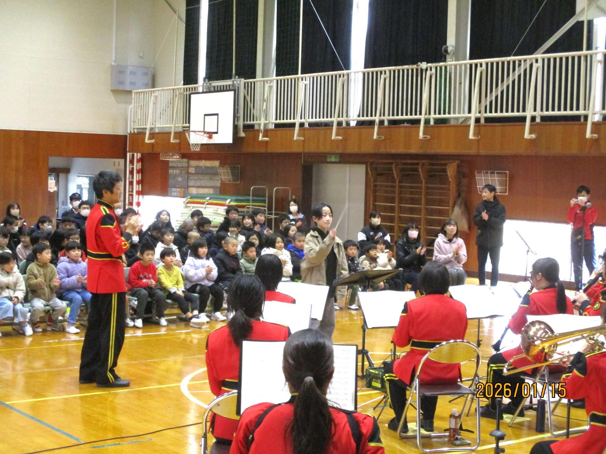 こどもたちの代表が指揮をさせてもらう場面もありました。緊張しながらも、リズムよくタクトを振りました。演奏が終わると、代表児童のあいさつにあわせて、全校のみんなでお礼を言いました。あっという間の45分間でした。全校のみんなが音楽に親しんだ、とても楽しい時間でした。