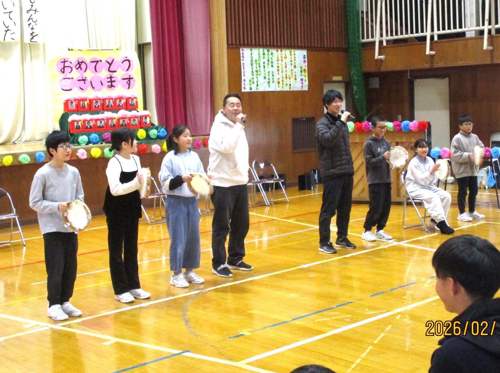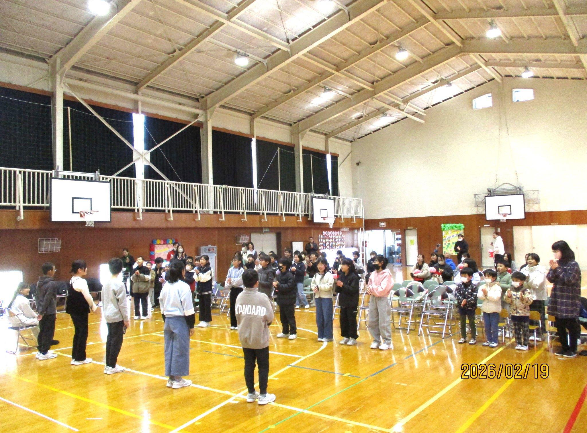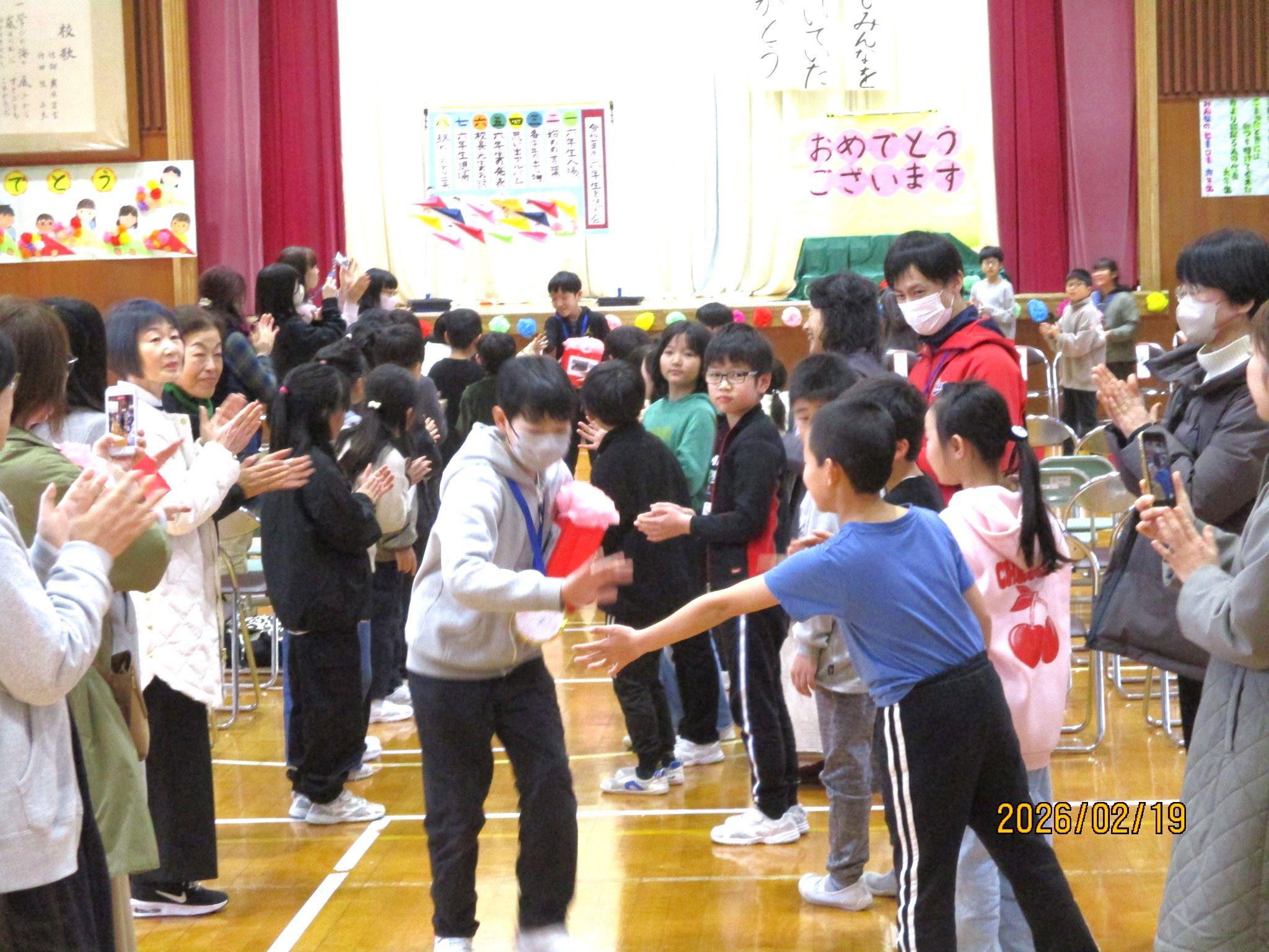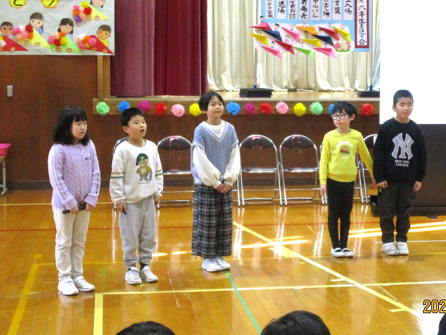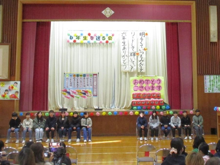 5年生が中心になって計画・運営してくれた6年生を送る会。最後に5年生から、協力して会を成功させてくれた1~4年生にお礼のあいさつがありました。すると、「ちょっと待った!」と4年生の声。今回、全体のお世話をがんばった5年生に対して、1~4年生からお礼の言葉やエールが送られました。卒業式まで1か月を切りました。いろんなバトンを6年生から受け継いでいきますが、「きっと大丈夫。」と感じた場面でした。