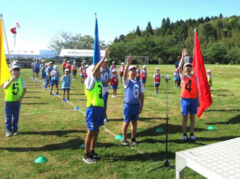 開会式での1年生による開会宣言、運営委員によるあいさつ、園児による選手宣誓、色長による選手宣誓。
