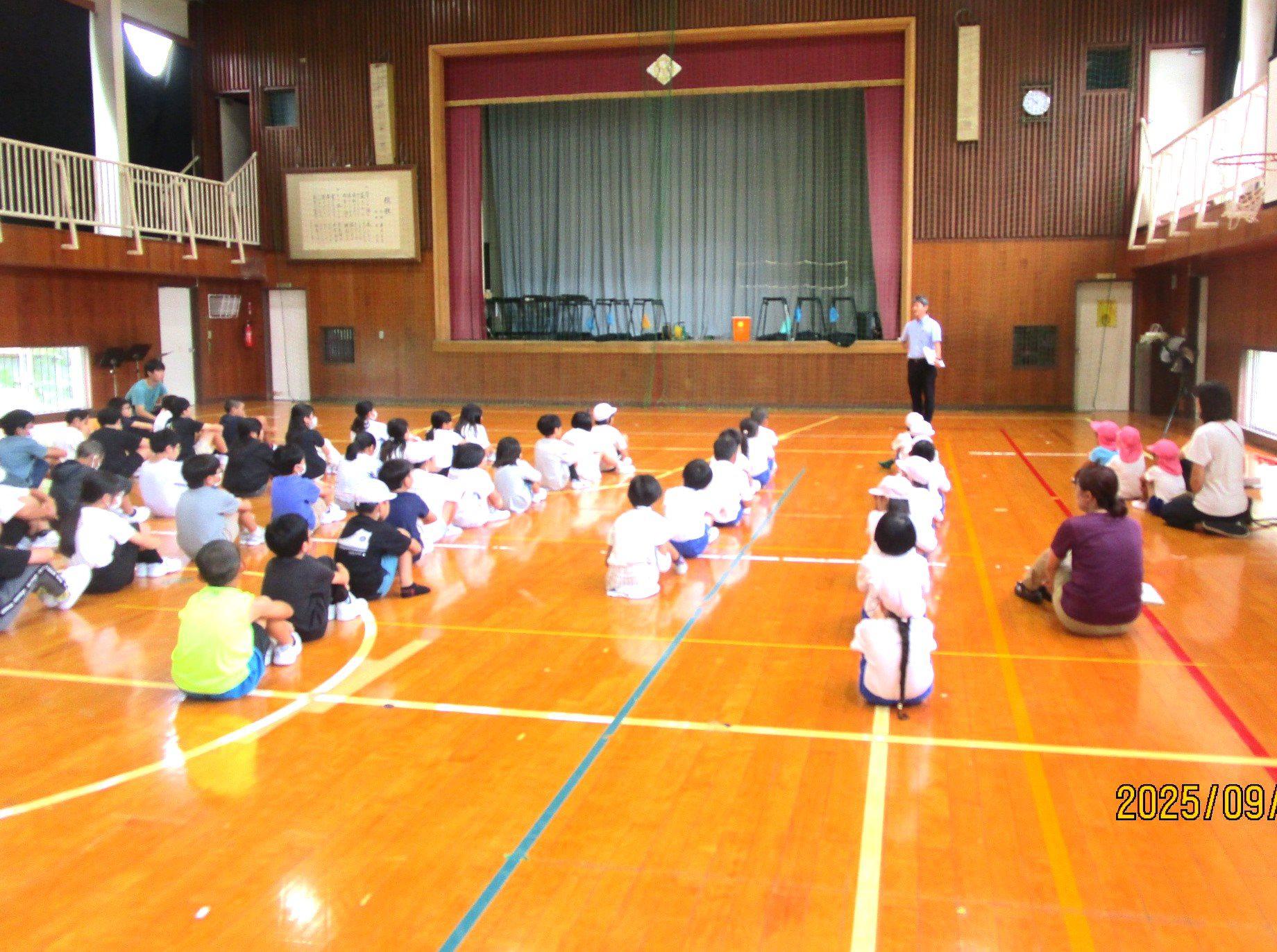 非常ベルが鳴ると、校庭にいたこどもたちも一か所に集まって、次の放送を静かに待っていました。体育館に避難することが分かると、全校児童が静かに体育館に集まってきました。場所によっては、高学年が低学年に上手に声をかけていたようでした。本当に避難が必要なときにも、今日のように「あ!お・は・し・も・て」の合言葉を守って安全に避難しましょう。