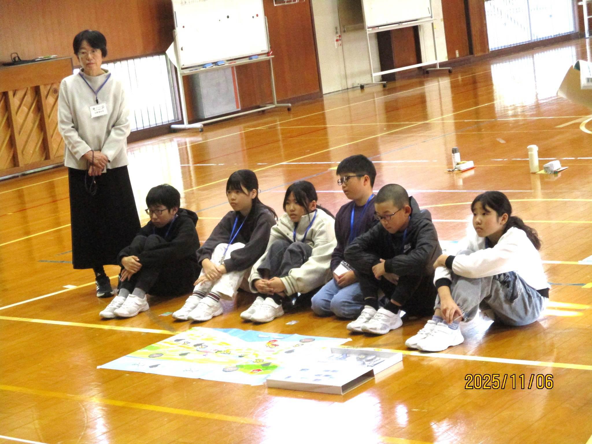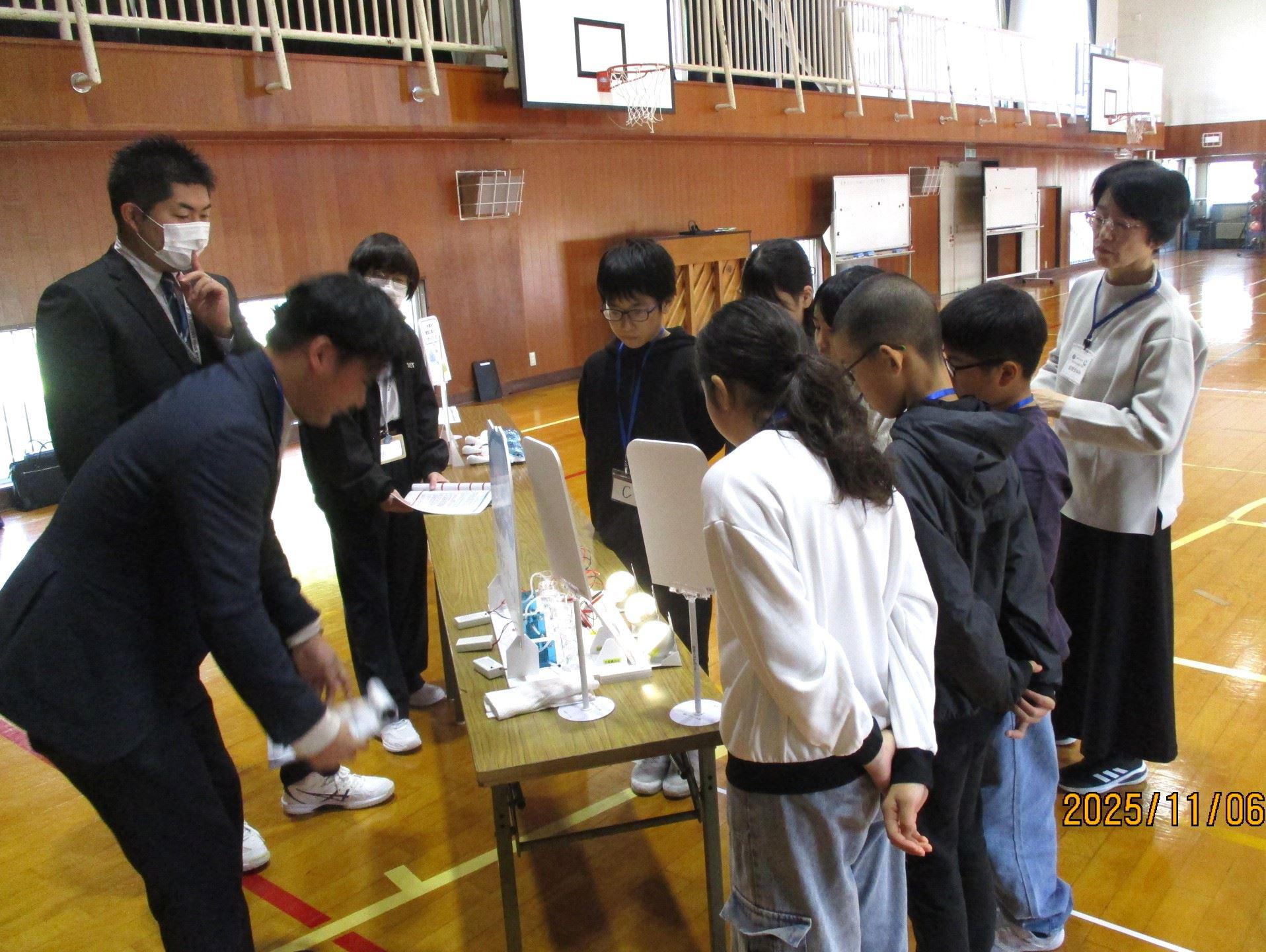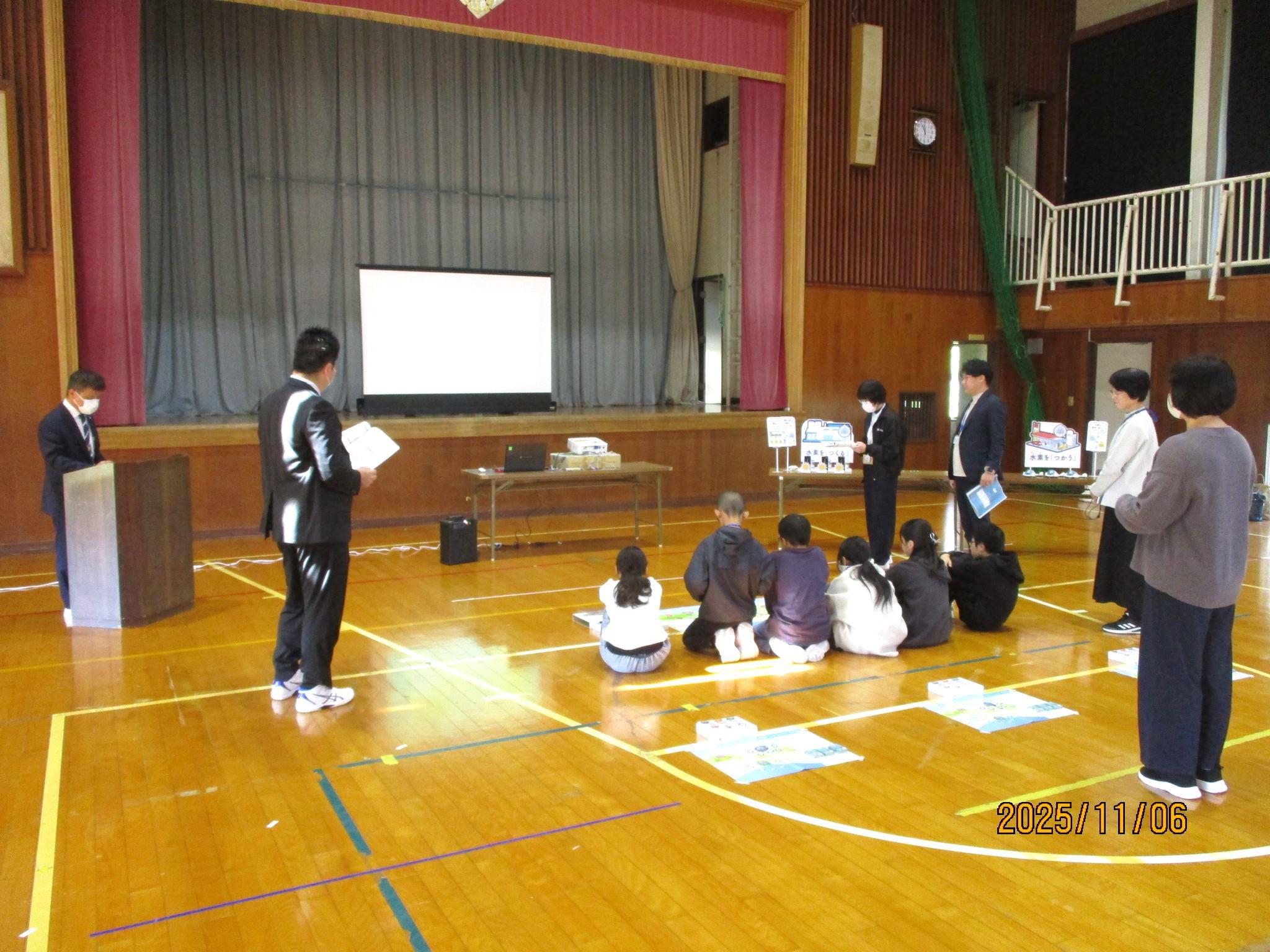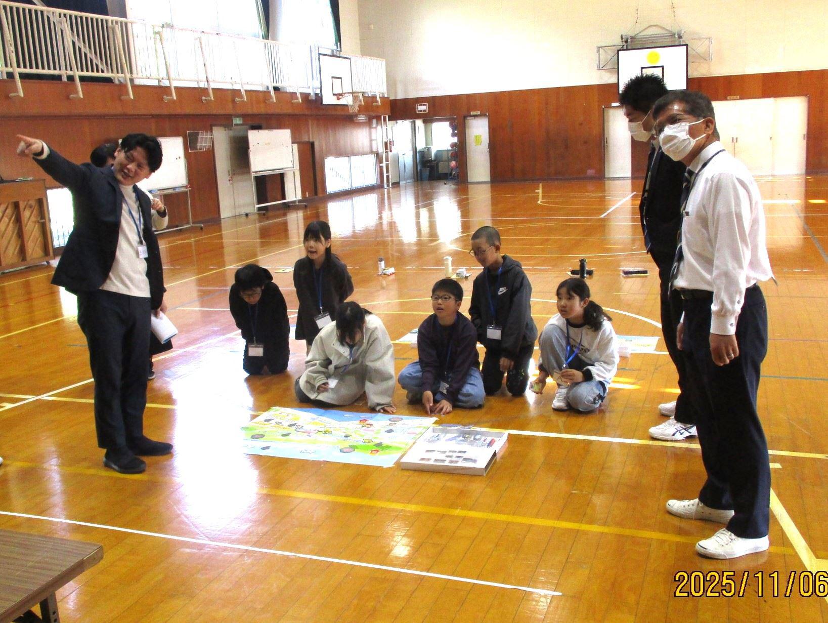 太陽光発電で作った電気で、水から水素と酸素を作る簡単な実験も観察しました。そうして作った水素と酸素を使って、 ミニカーを走らせてみました。本当に走り出すミニカーを興味津々に見つめたり、止まりそうになると「がんばれ!」と応援したりするこどもたちでした。その他にも、二酸化炭素の排出量の削減に必要な取組について、子どもたちが協力してゴールをめざすカードゲームの体験を通して、楽しみながら学習しました。体験的な活動を通して、地球環境について学んだり、未来の環境について自分たちで考えたりすることができた出張授業でした。