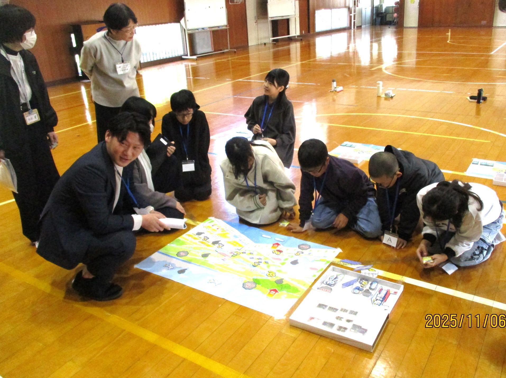 持続可能エネルギーについてお話を聞いた後、マップ上で太陽光発電所や風力発電所が設置できる場所を考えてみたり、そうして作られた電気で動く乗り物に置き換えてみたりしました。