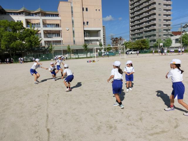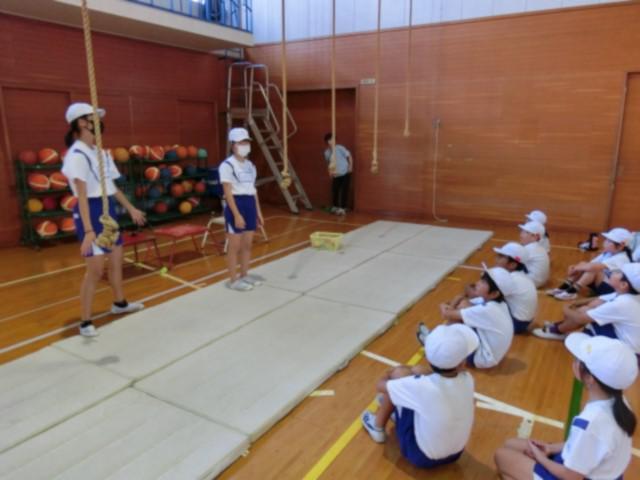 「支える」「構える」などそれぞれの種目のねらいにそって、高学年がやさしくリードしこつを教えていました。