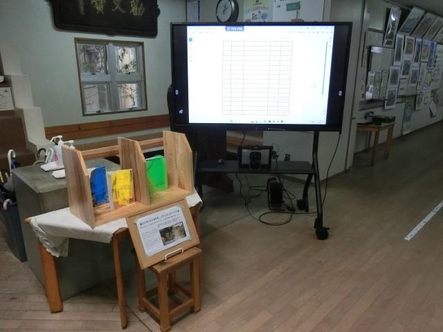 〈昇降口:ウエルカムボードと松江城の木で作られた本棚の紹介〉画像を一部加工しています