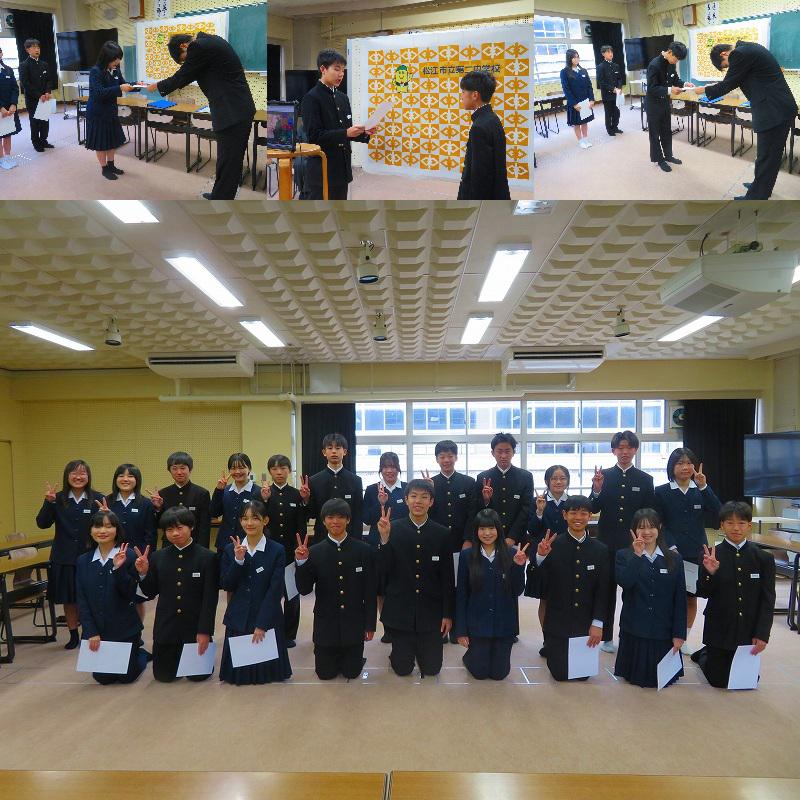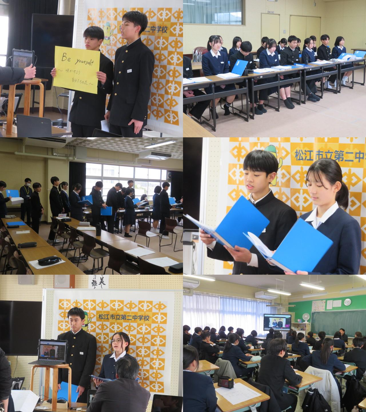 令和8年生徒会による生徒総会でスローガンの発表がありました。執行部がスローガンに込めた思いを紹介します。「令和8年生徒会スローガンは『Be yourself ~咲かせよう自分たちの花~』です。『Be yourself』とは、『自分らしくいこう』という意味です。ただ楽しい松江二中ではなく、自分らしさを存分に出せて楽しい学校をめざしていこうという意味が込められています。副題の『咲かせよう自分たちの花』には、一人だけで花を咲かせるのではなく、みんなで同じ方向を向いて、お互いを大切にしあって咲いていこうという思いを乗せています。このスローガンを通して、誰もが自分らしさを出せる〝楽しい学校″にしていきましょう。」学級生徒会から寄せられた質問に丁寧に回答し、そして新たな取組が始まろうとしています。令和8年の生徒会活動にも期待をしています。