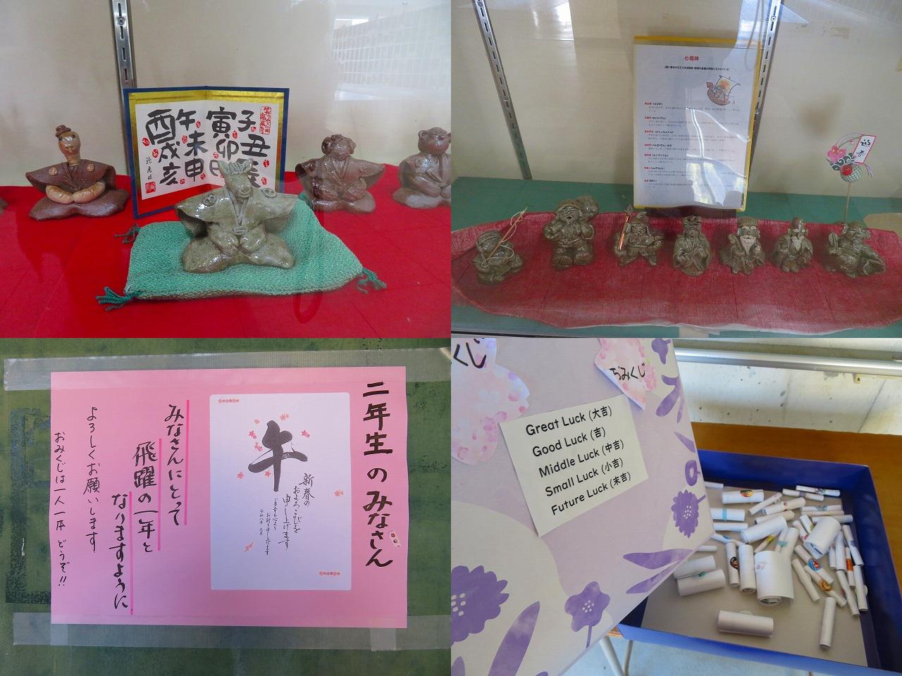 昇降口には、干支や七福神が勢ぞろいで、みんなを見守ってくれています。また、2年生の石渡りを歩いていましたら、新年のご挨拶とおみくじが! このおみくじは、実は職員も8日にひとつづついただいていました。私がいただいたのは「Out of the mouth comes evil.」日本のことわざでいうと、そうです「口はわざわいの元」。うっかり言ってしまった言葉で失敗したり人を傷つけたりすることがあります。自分の口から出る言葉に注意しよう、とありました。新年早々、戒めです。今年も自分を律していきたいと思います。