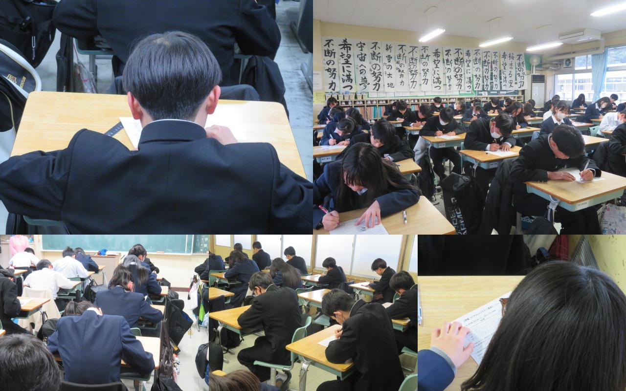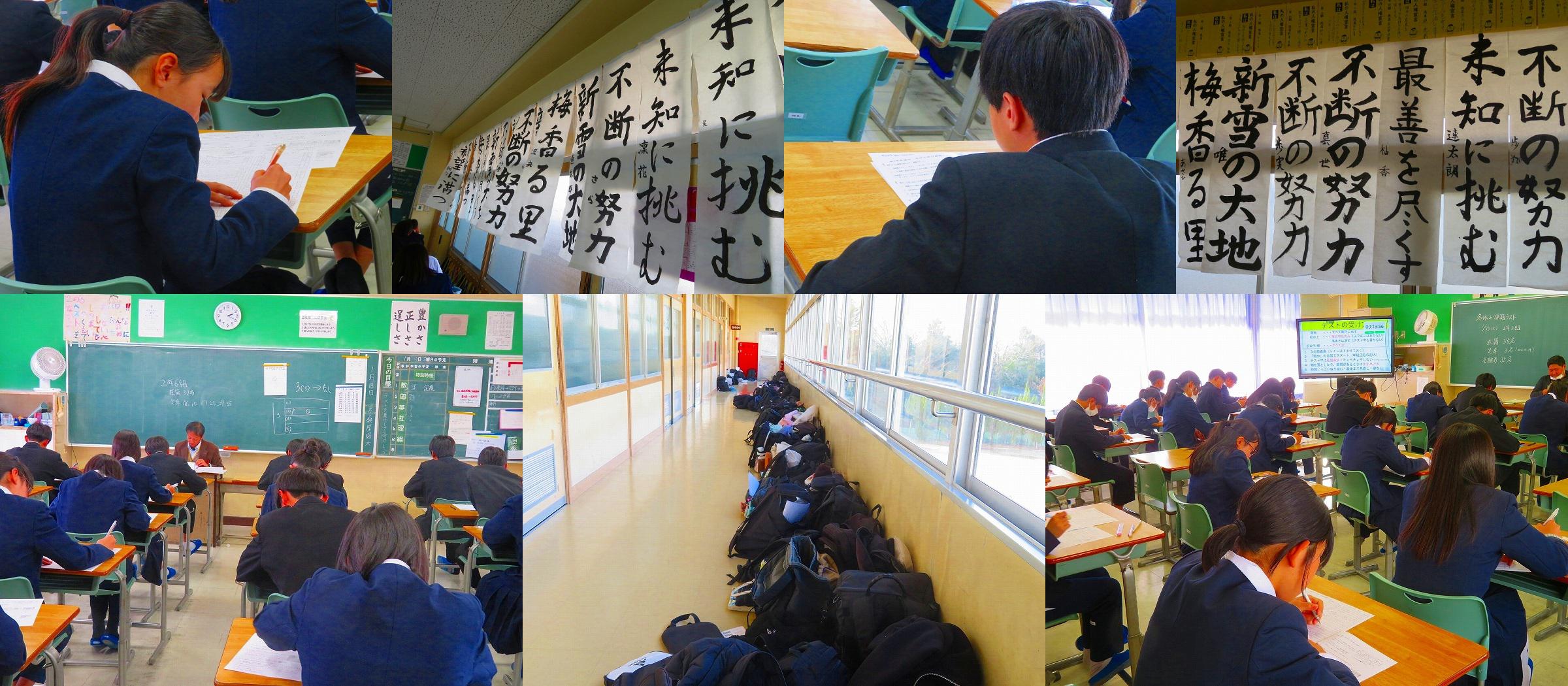 三連休明け、二中の生徒はテストに臨んでいました。1、2年生は冬休みの課題のテストに、3年生は入試対策校内模擬試験に真剣に向き合っていました。今、教室には書初めの作品も掲示してありますので、テストに向き合っている姿と条幅にしたためられた毛筆の字が合わさって、なんだか心あらたまる気もちになりました。がんばった!お疲れさまでした!