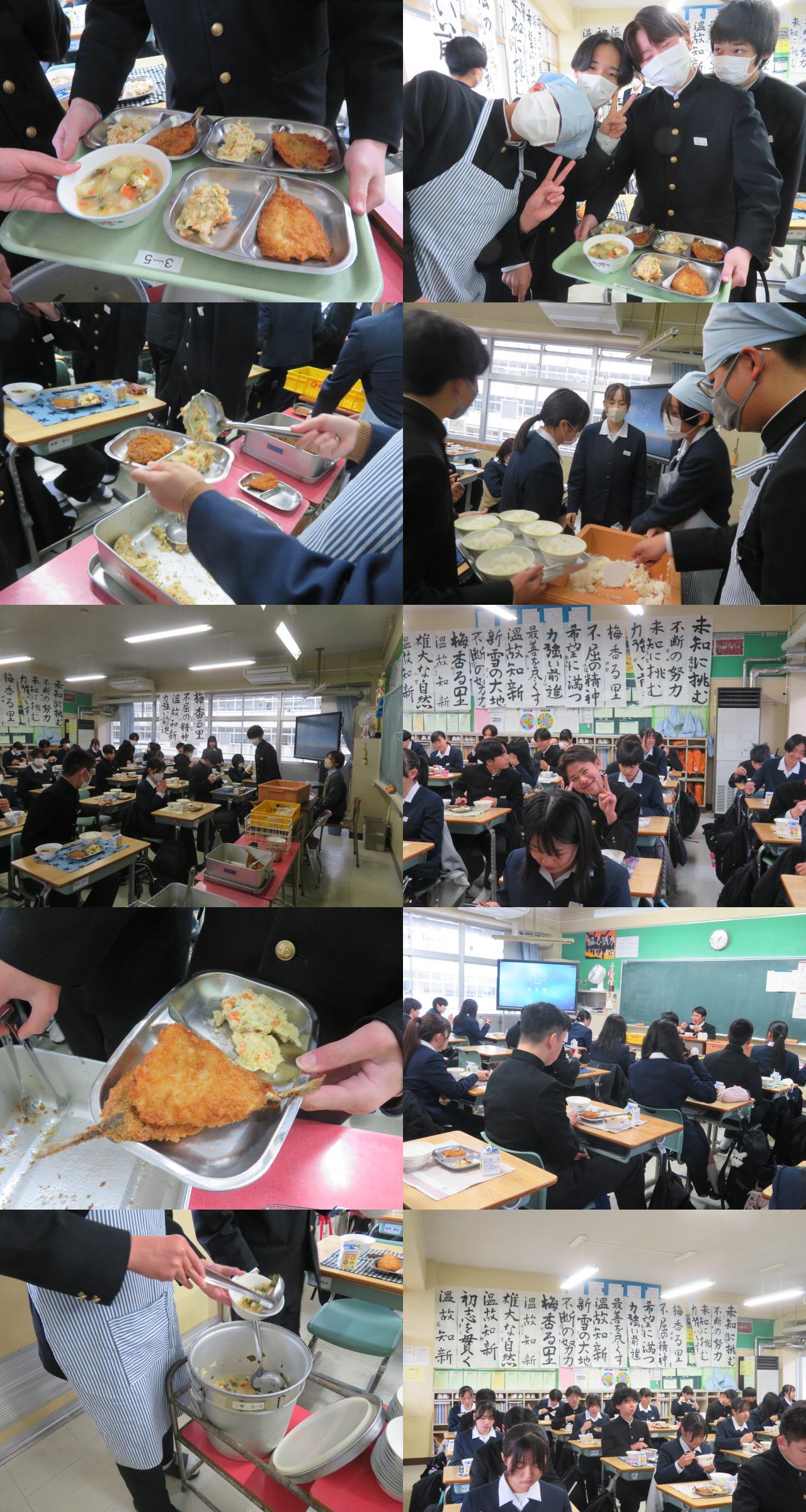 ところで、勉強するにも体力が必要です。今日の給食はアジフライでした。「ミルクおから」は初めての味。美味しかったです。3年生の教室では手際よく盛り付け、美味しそうに食べていました。