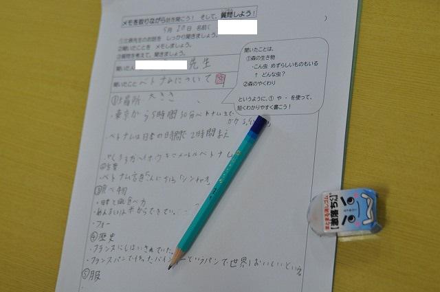 子どもたちのねらいはあくまでもメモをとる学習なので、聞きながら要点をメモしています