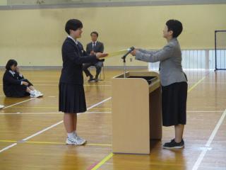 今朝は5月の全校朝礼がありました。全校朝礼では生徒会本部の皆さんが司会進行をしてくれます。今日は県中学生バレーボール大会(女子の部Eゾーン 4/28開催)の表彰伝達と 今年度お世話になる石橋スクールカウンセラーさんの紹介を行いました。