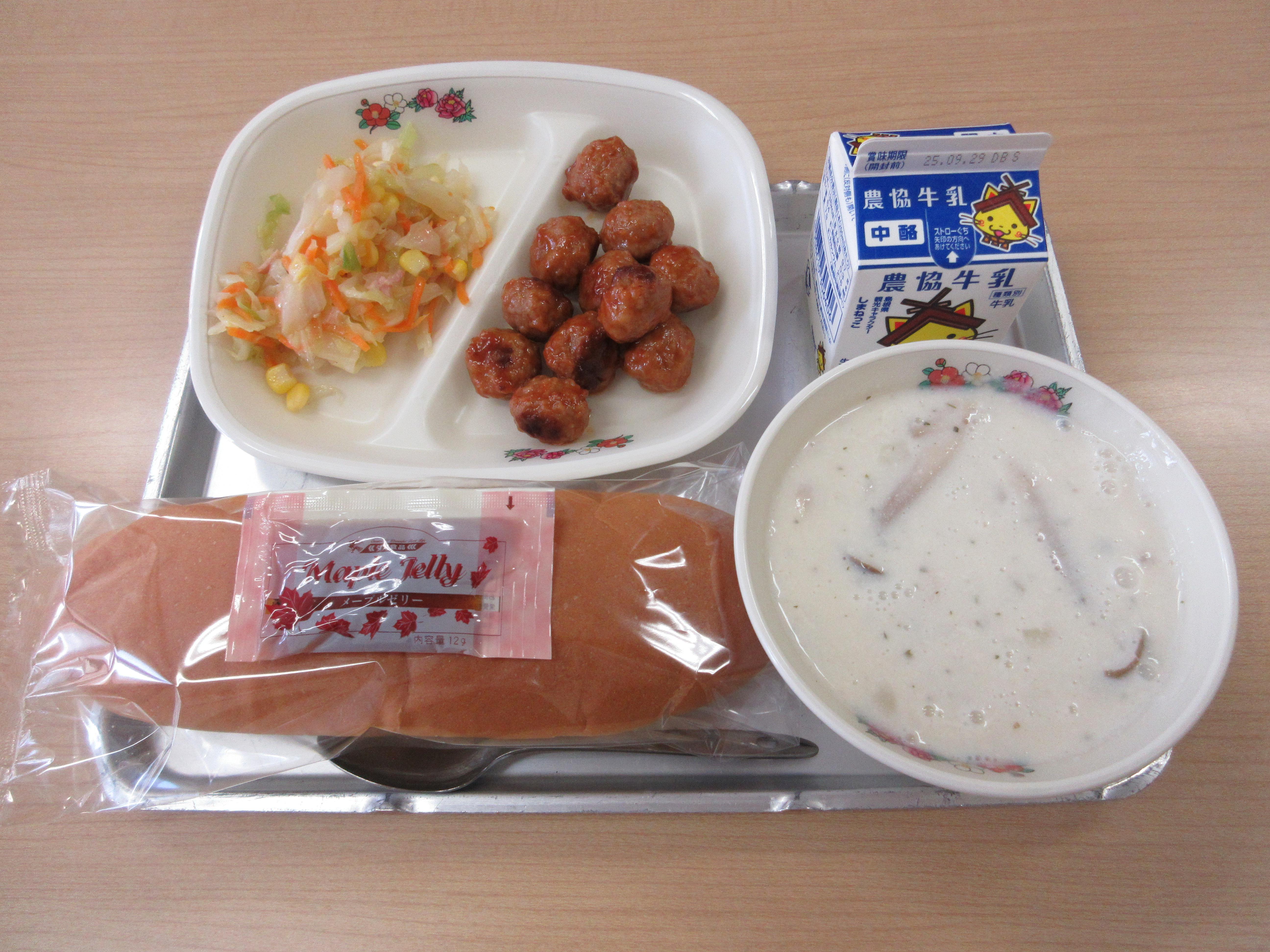 今日の給食:コッペパン、メープルジャム、牛乳、ミートボールのケチャップソース、野菜サラダ、豆乳スープ でした。今日もおいしくいただきました。