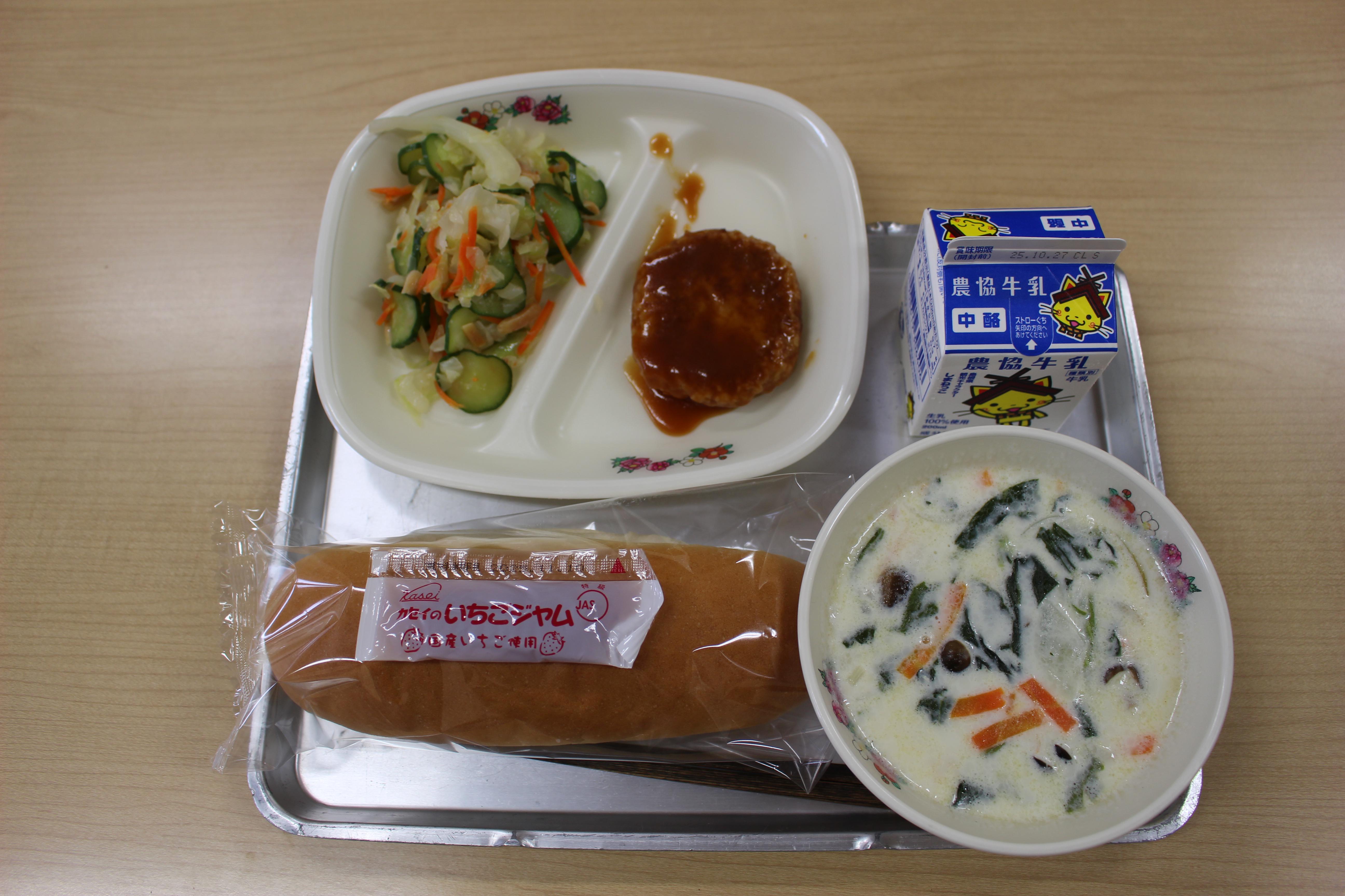 今日の給食:コッペパン、いちごジャム、牛乳、豆腐ハンバーグのデミグラスソース、アーモンドサラダ、牛乳クリームスープ でした。今日もおいしくいただきました。