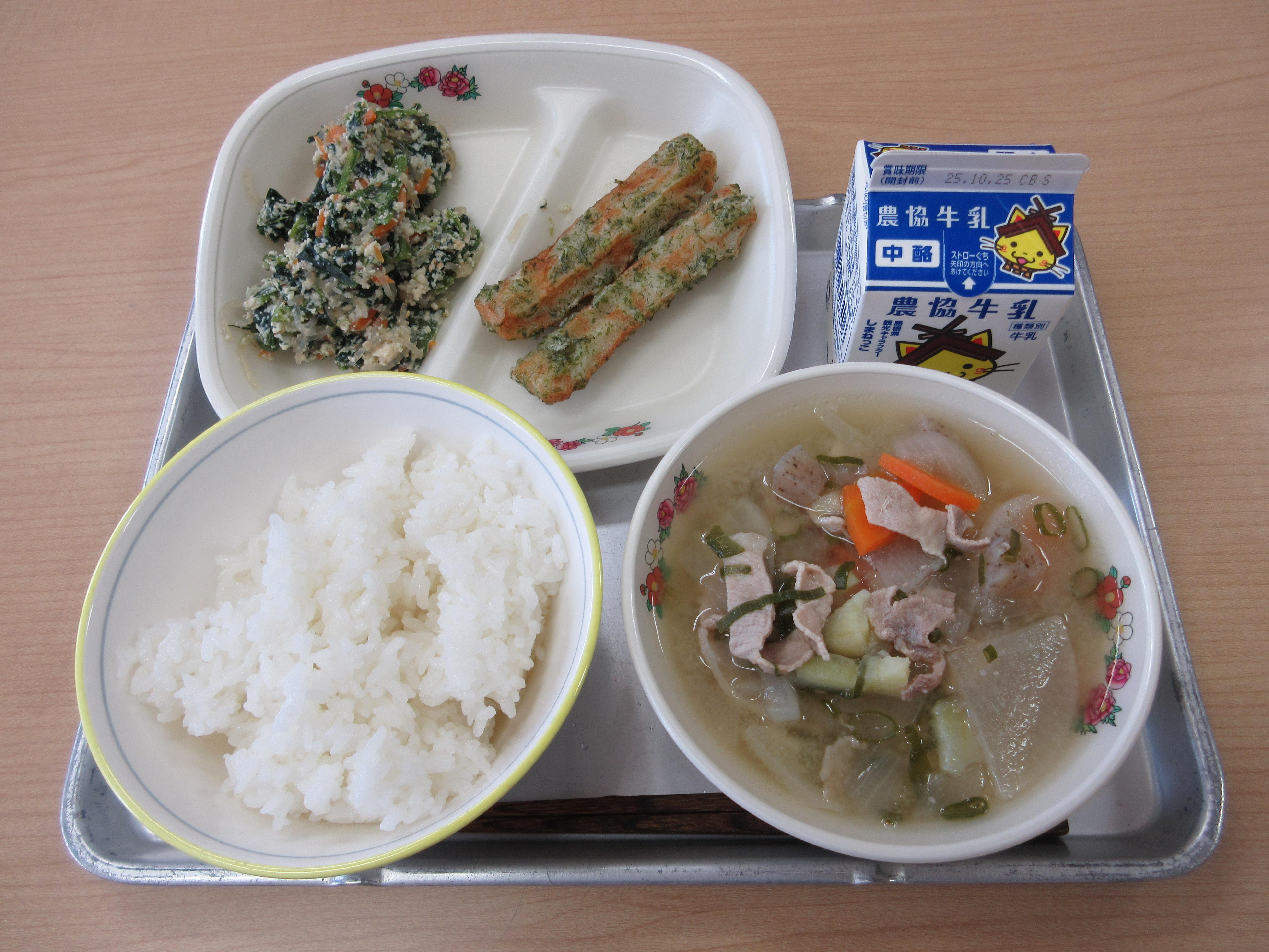 今日の給食:ごはん、牛乳、野焼きの磯辺揚げ、白和え、豚汁 でした。松江の特産品のあご野焼きをおいしくいただきました。