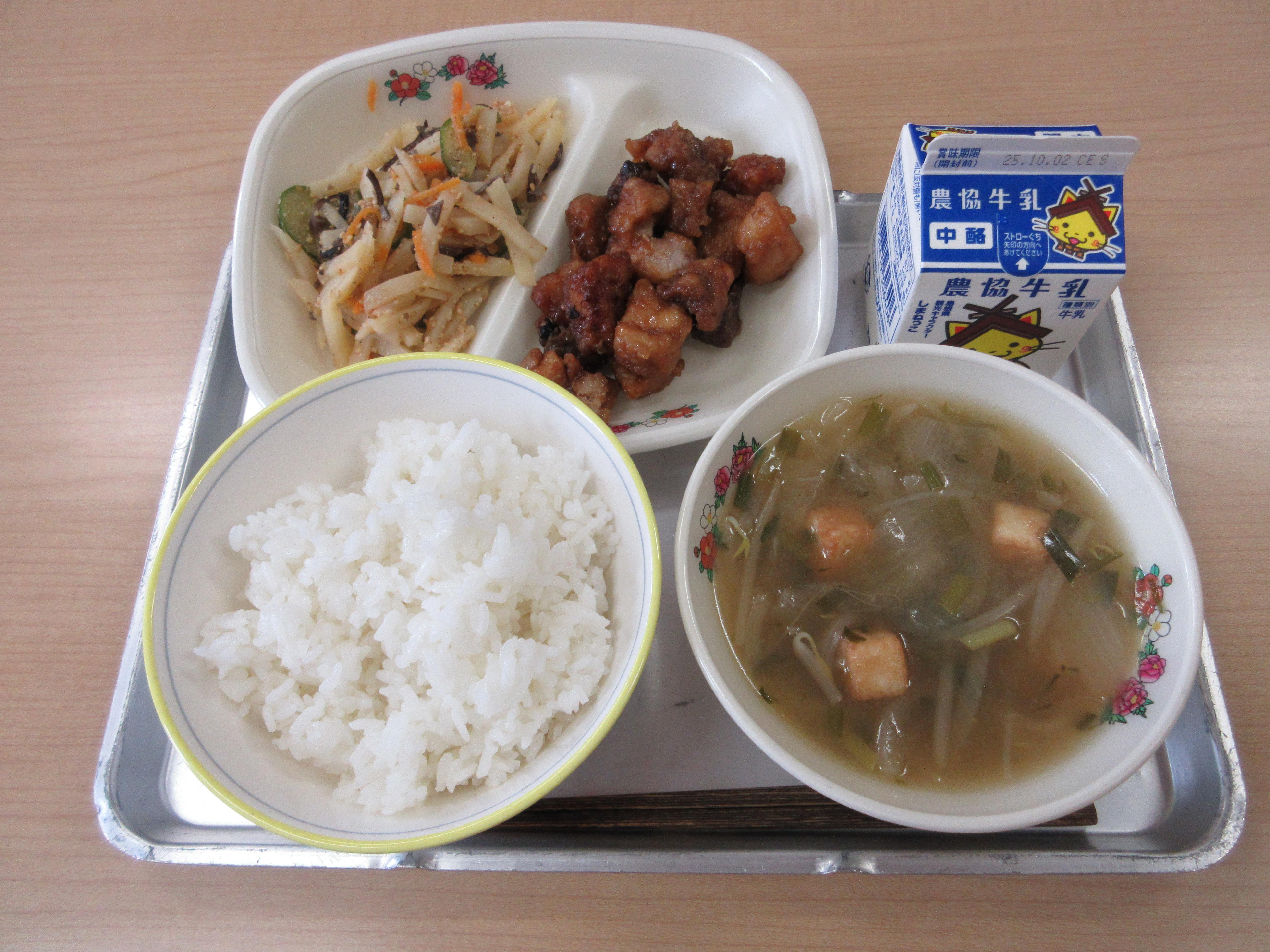 今日の給食:ごはん、牛乳、豚肉とレバーの揚げ煮、じゃがいものサラダ、厚揚げの中華スープ でした。今日もおいしくいただきました。