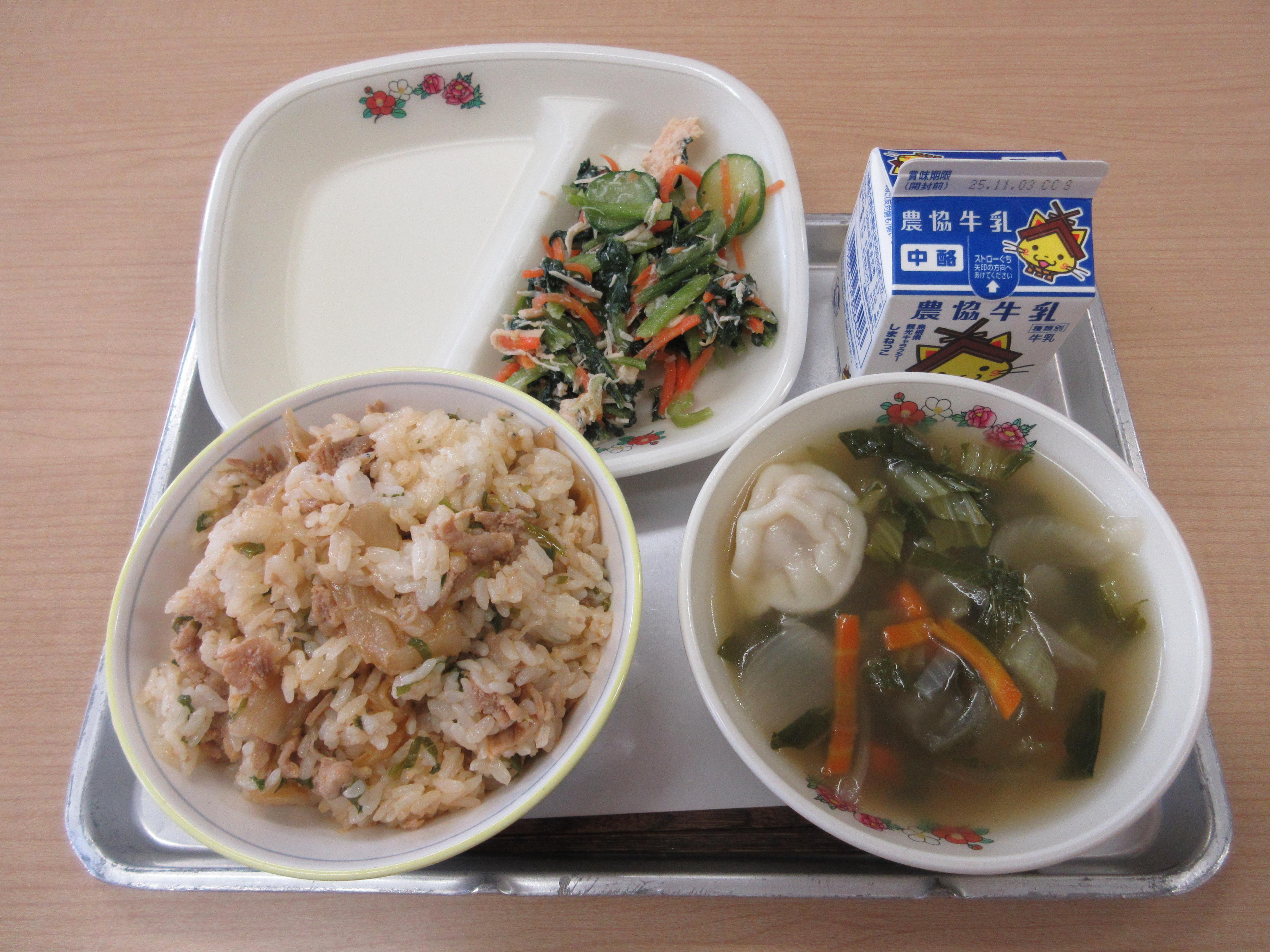 今日の給食:キムチじゃこチャーハン、牛乳、中華サラダ、ぎょうざスープ でした。今日もおいしくいただきました。