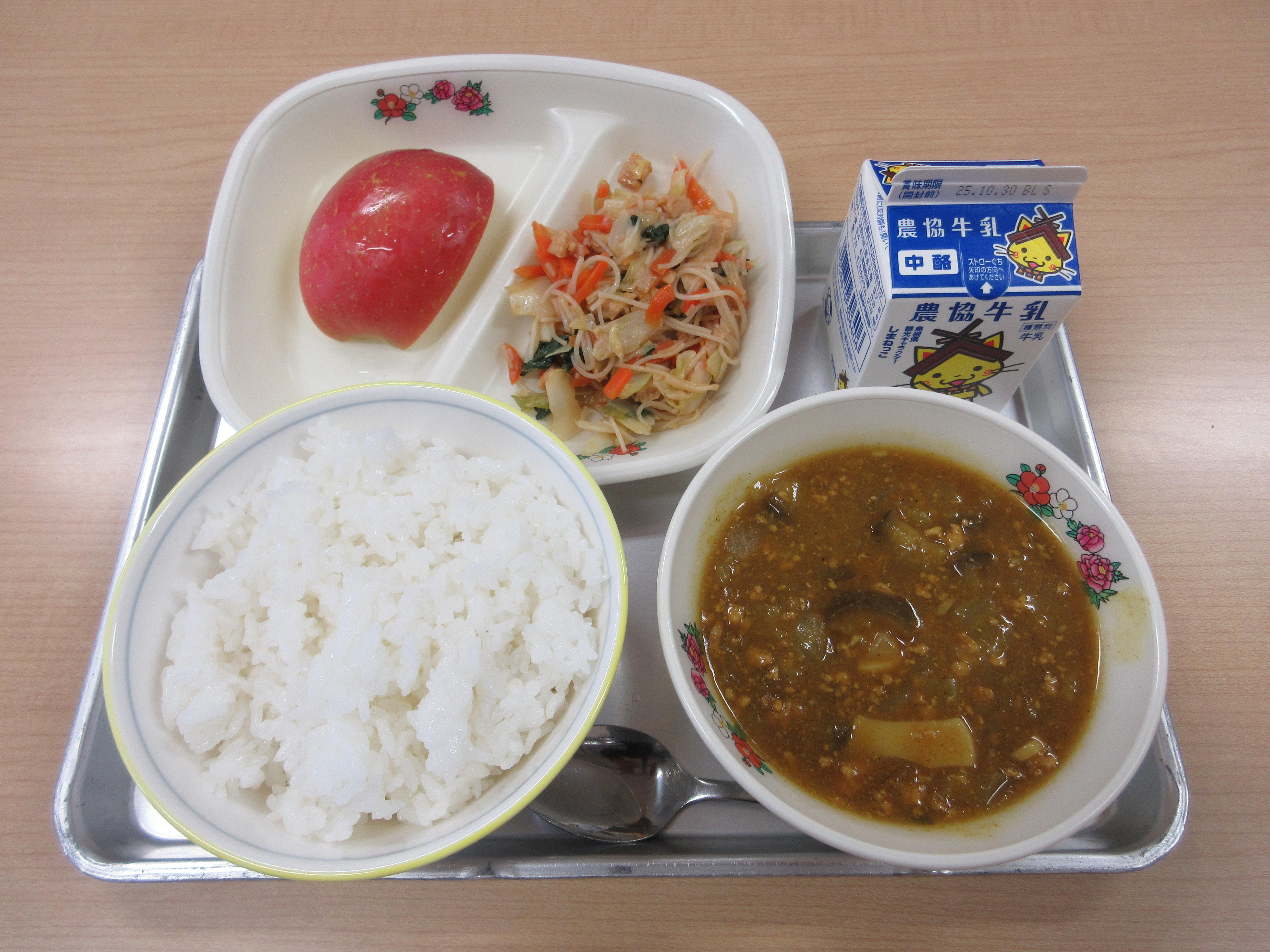 今日の給食:秋野菜カレーライス、牛乳、ビーフンと野菜のソテー、りんご でした。さつまいもやなす、チンゲン菜やきのこなど、秋が旬の野菜をおいしくいただきました。