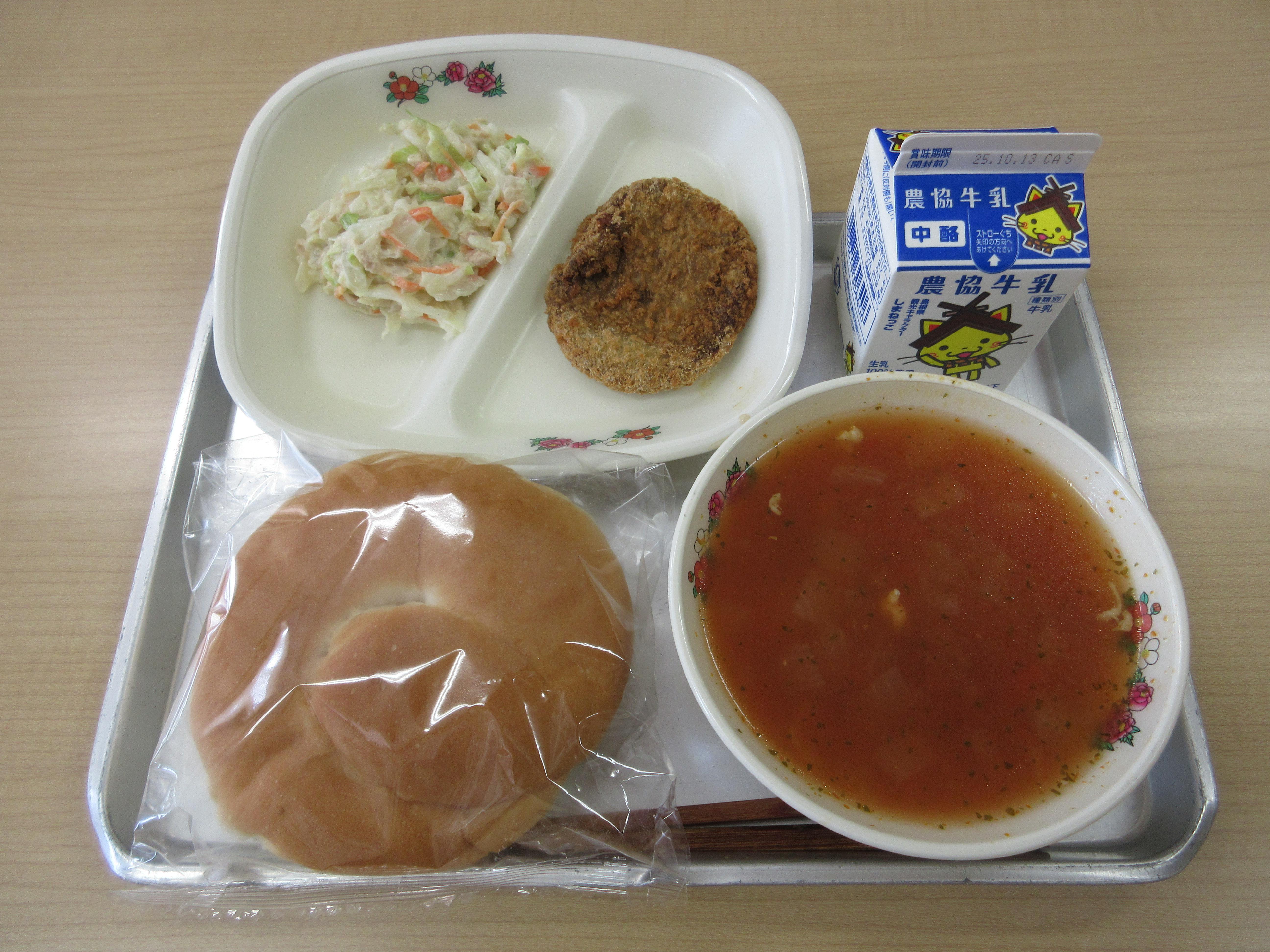 今日の給食:セルフメンチカツサンド、牛乳、コールスローサラダ、ミネストローネ でした。今日もおいしくいただきました。