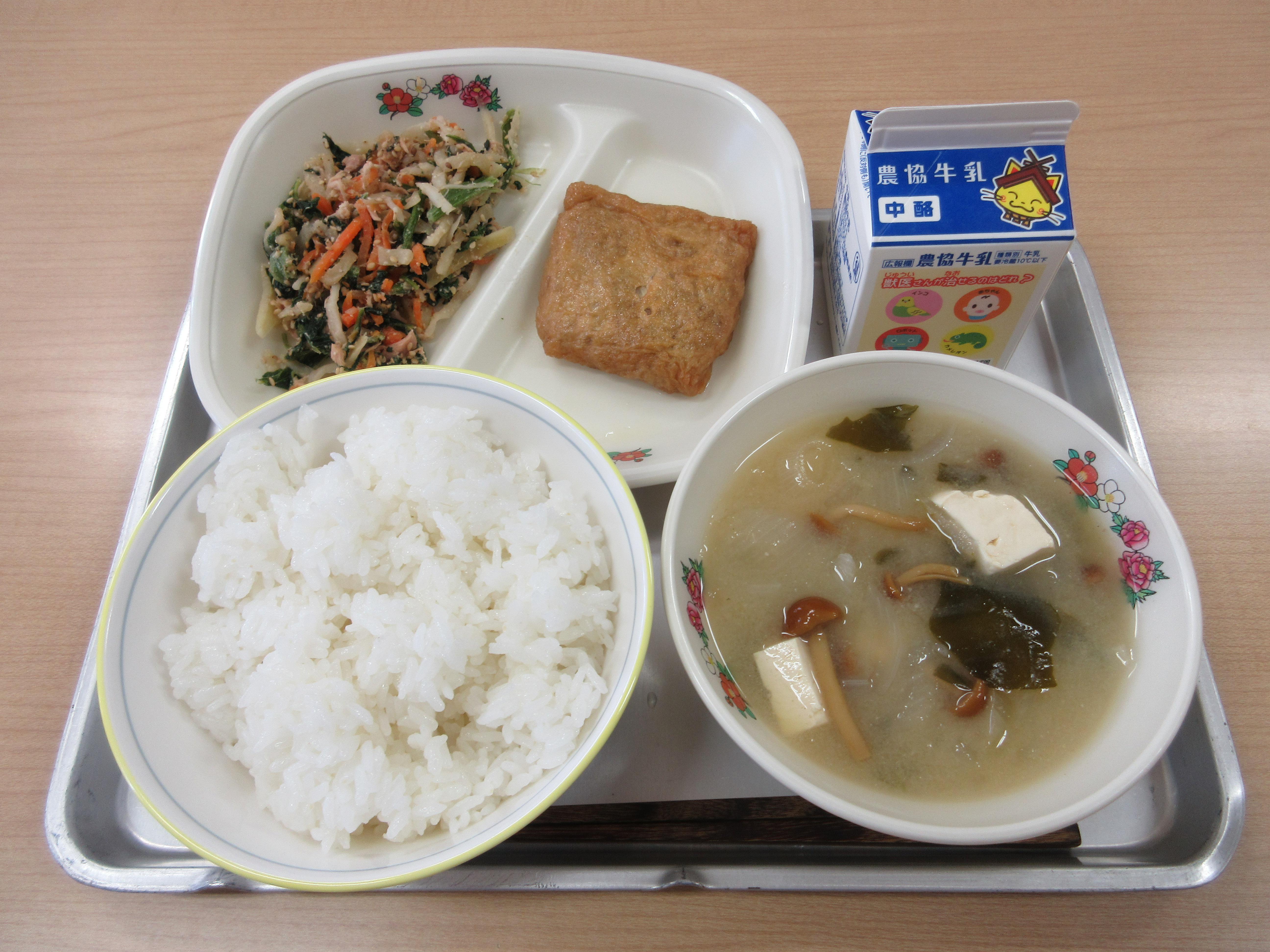 今日の給食:ごはん、牛乳、肉信田の含め煮、切干大根のごま和え、なめこの味噌汁 でした。今日もおいしくいただきました。