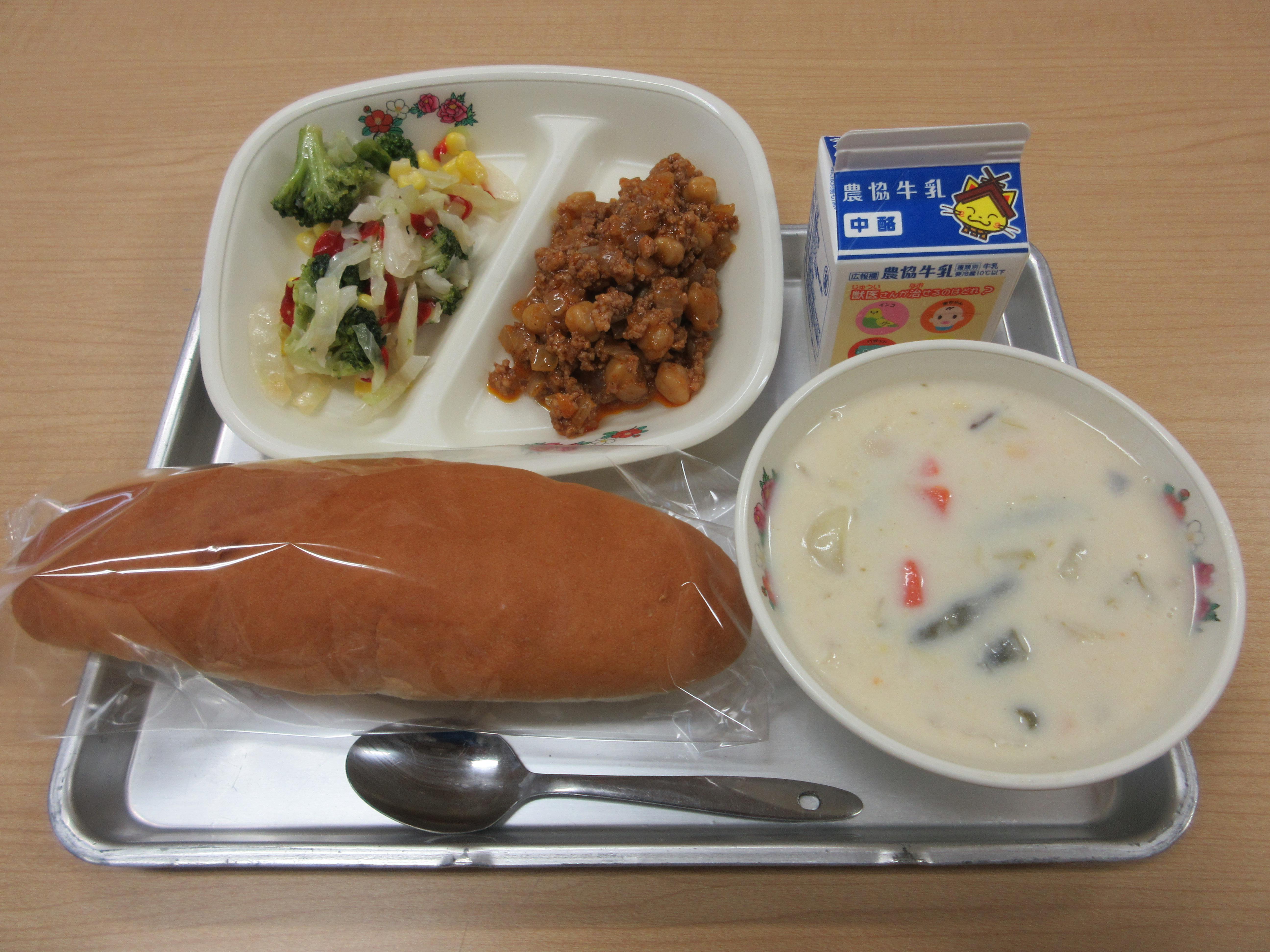 今日の給食:セルフミートサンド(コッペパン、セルフミート)、牛乳、カラフルサラダ、豆乳ポテトスープ でした。10月29日から11月9日は「秋の読書週間」です。今日の給食では読書週間にちなんで、絵本「ポテト・スープが大好きな猫」に出てくるポテトスープが登場しました。絵本の世界を想像しながらいただきました。