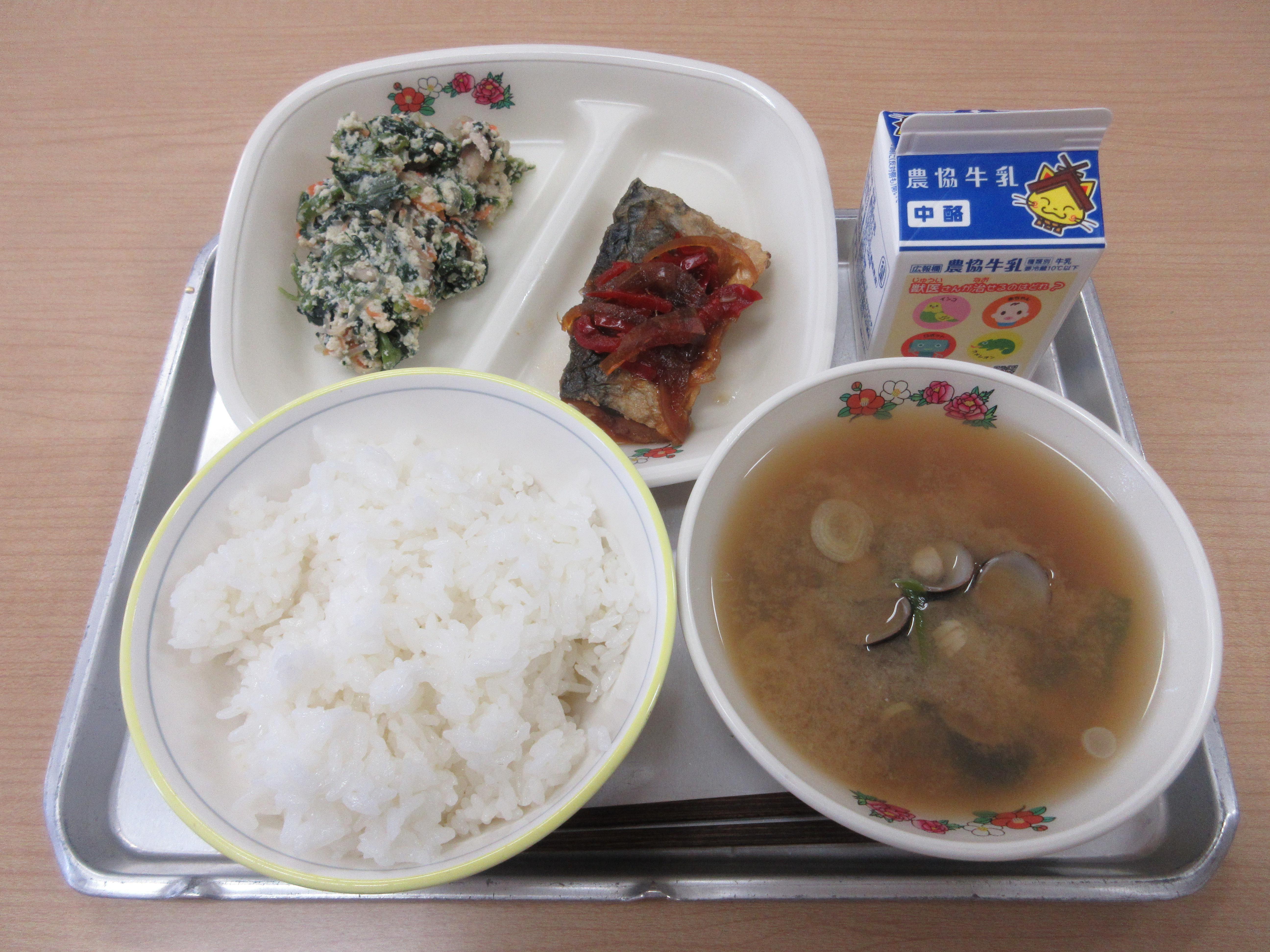 今日の給食:ごはん、牛乳、さばの南蛮漬け、白和え、宍道湖のしじみ汁 でした。松江の宍道湖といえば「しじみ」、栄養たっぷりのしじみ汁をおいしくいただきました。