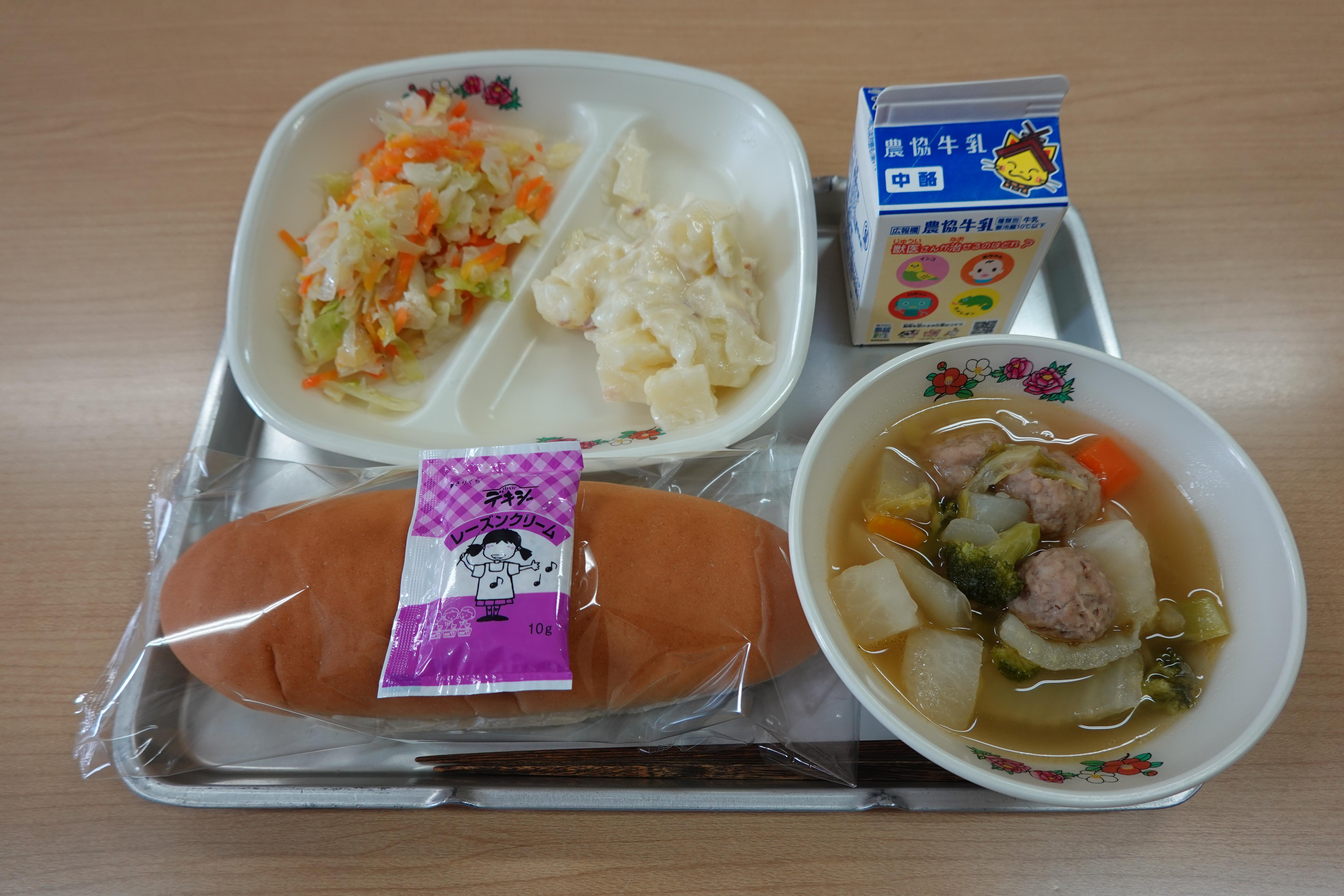 今日の給食:コッペパン、レーズンクリーム、牛乳、じゃがいもとチーズのソテー、カリフラワーのサラダ、ポトフ でした。松江市産のキャベツや大根、白菜やにんじんをおいしくいただきました。