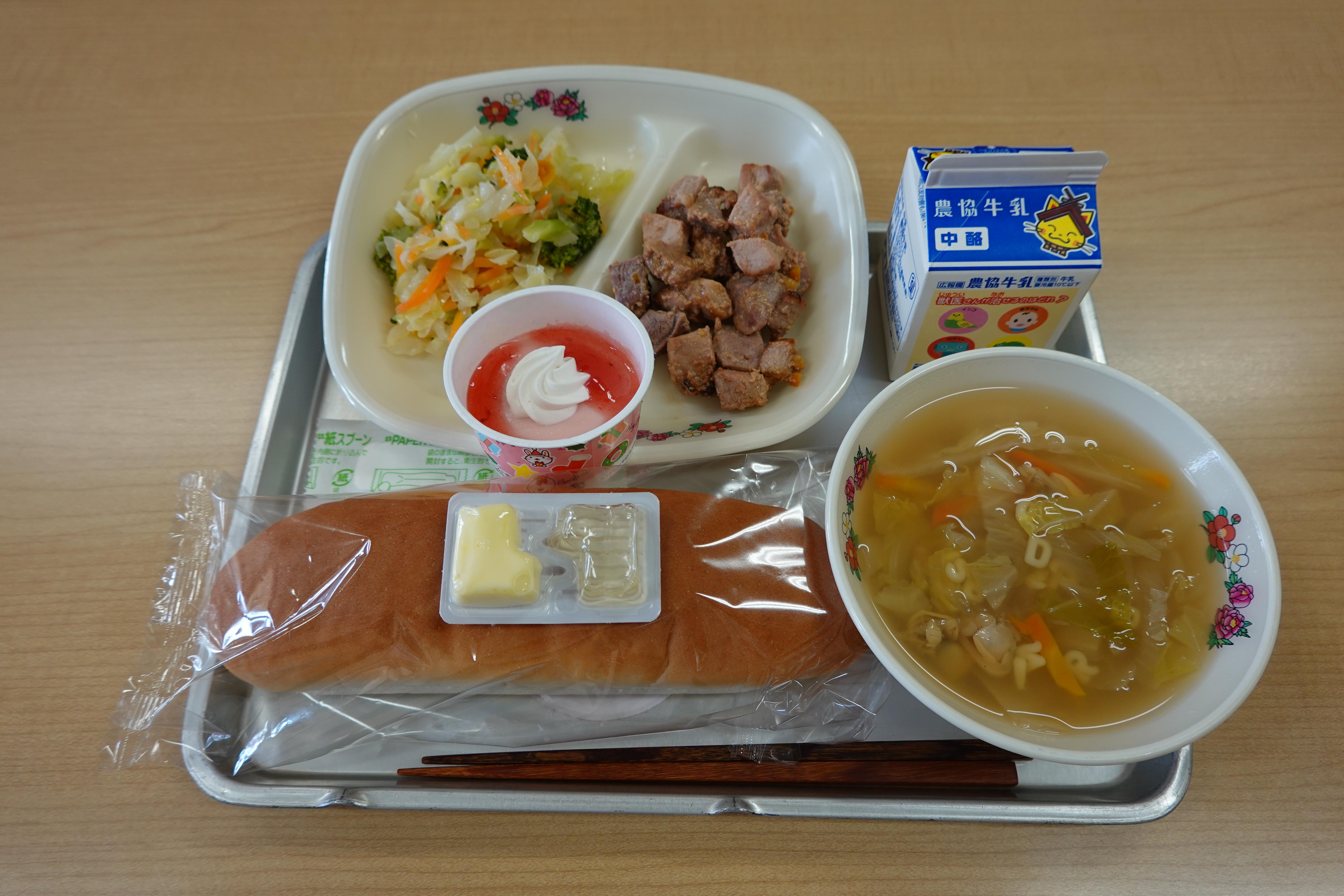 今日の給食:コッペパン、はちみつアンドマーガリン、牛乳、豚肉のマーマレード焼き、カラフルサラダ、あさりのスープ、いちごのカップデザート でした。今日はお楽しみメニューでした。今日もおいしくいただきました。
