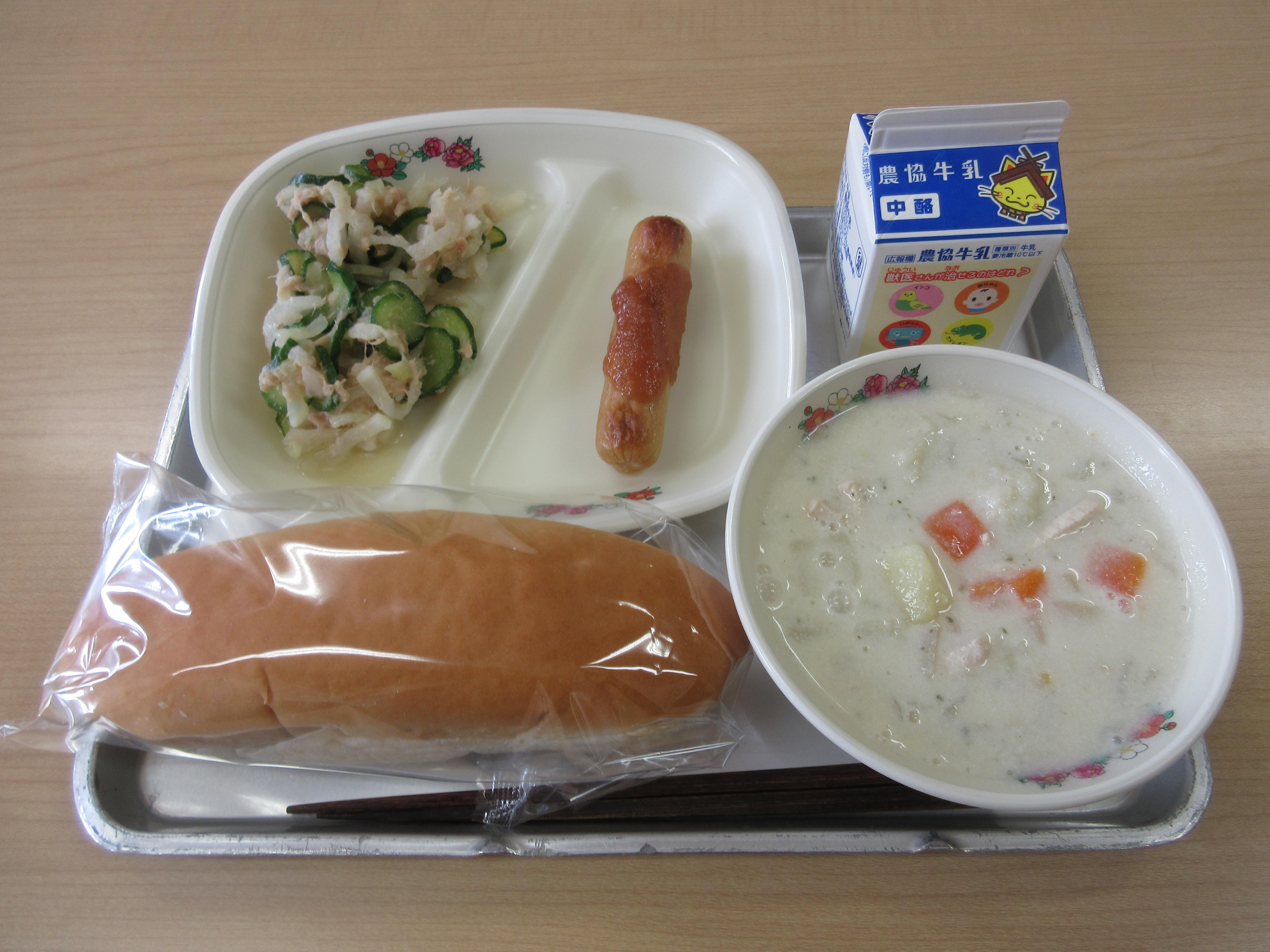 今日の給食:セルフドッグ、牛乳、大根とツナのサラダ、カリフラワーの豆乳クリームスープ でした。お昼の放送では、放送委員さんから手洗いをしっかりしましょうという話がありました。手洗いをしっかりして感染症を予防していきたいと思います。