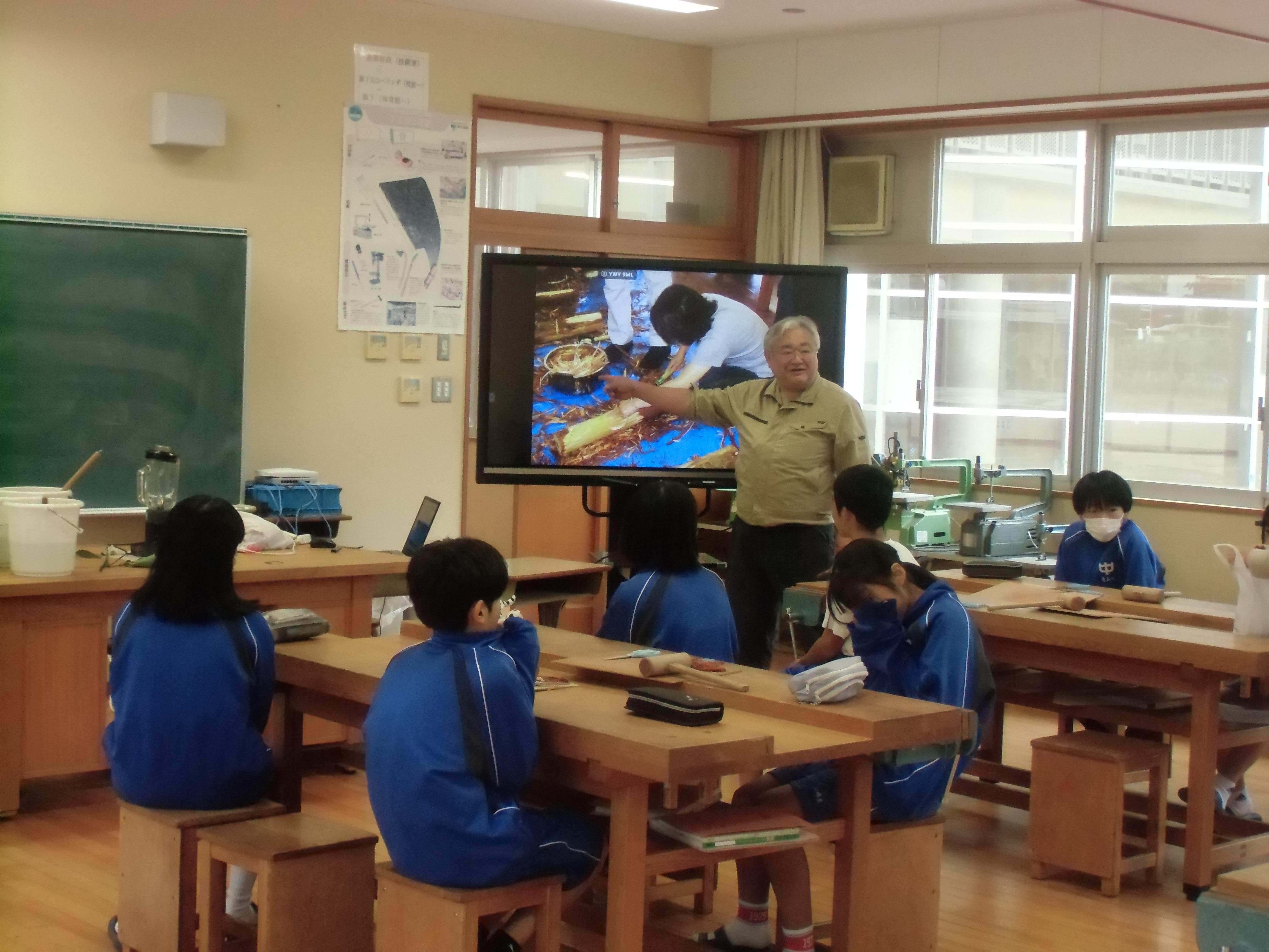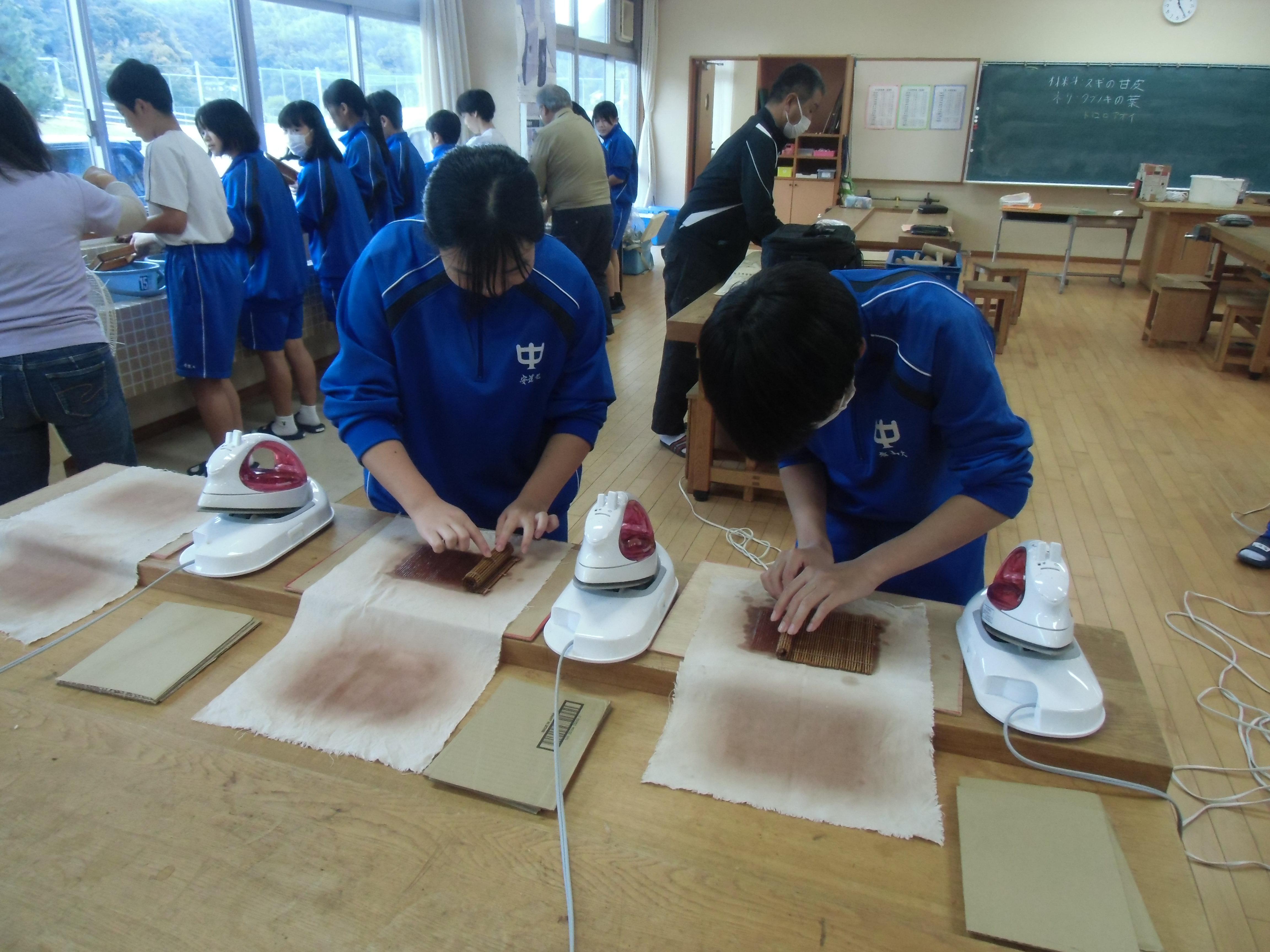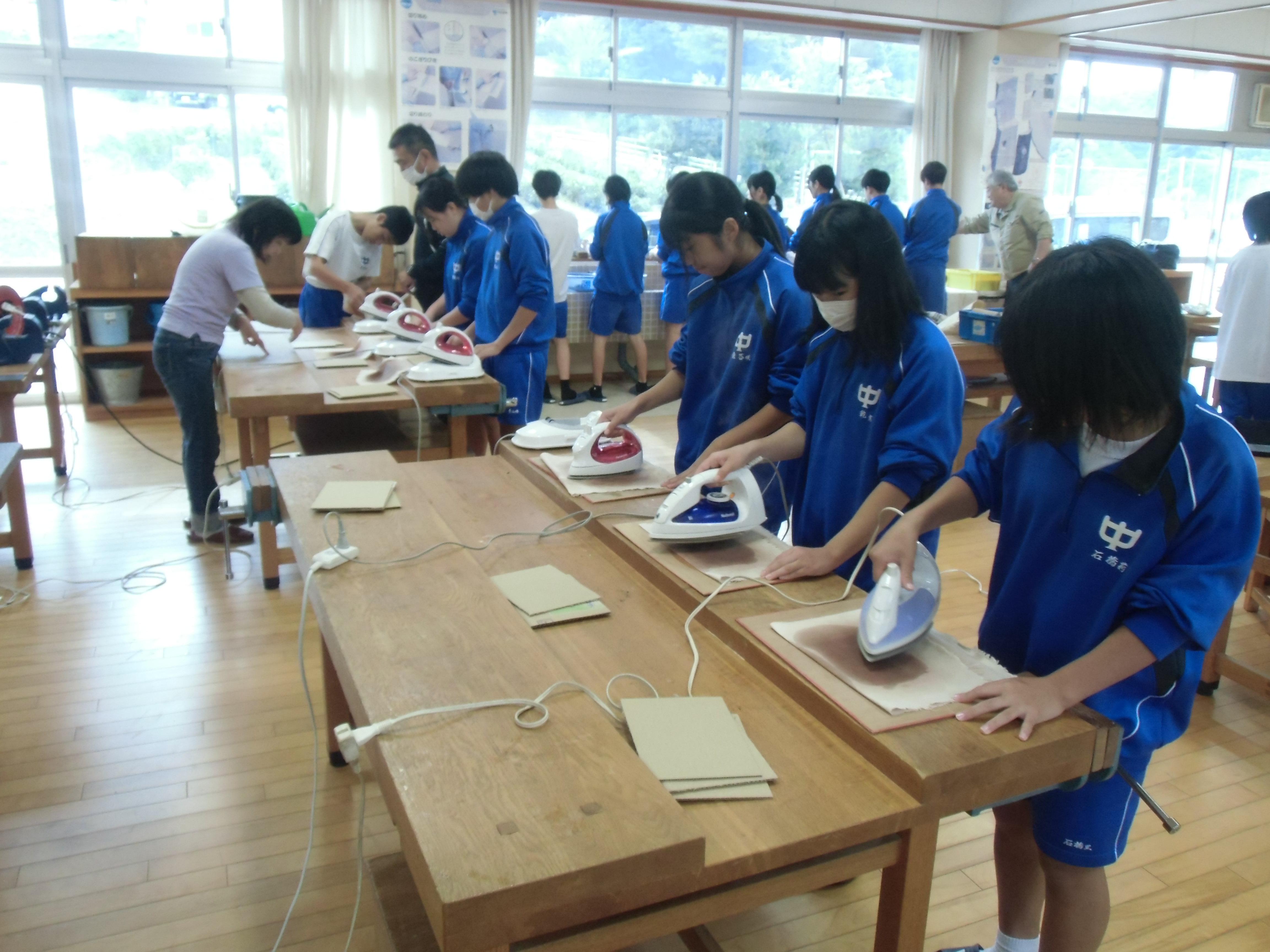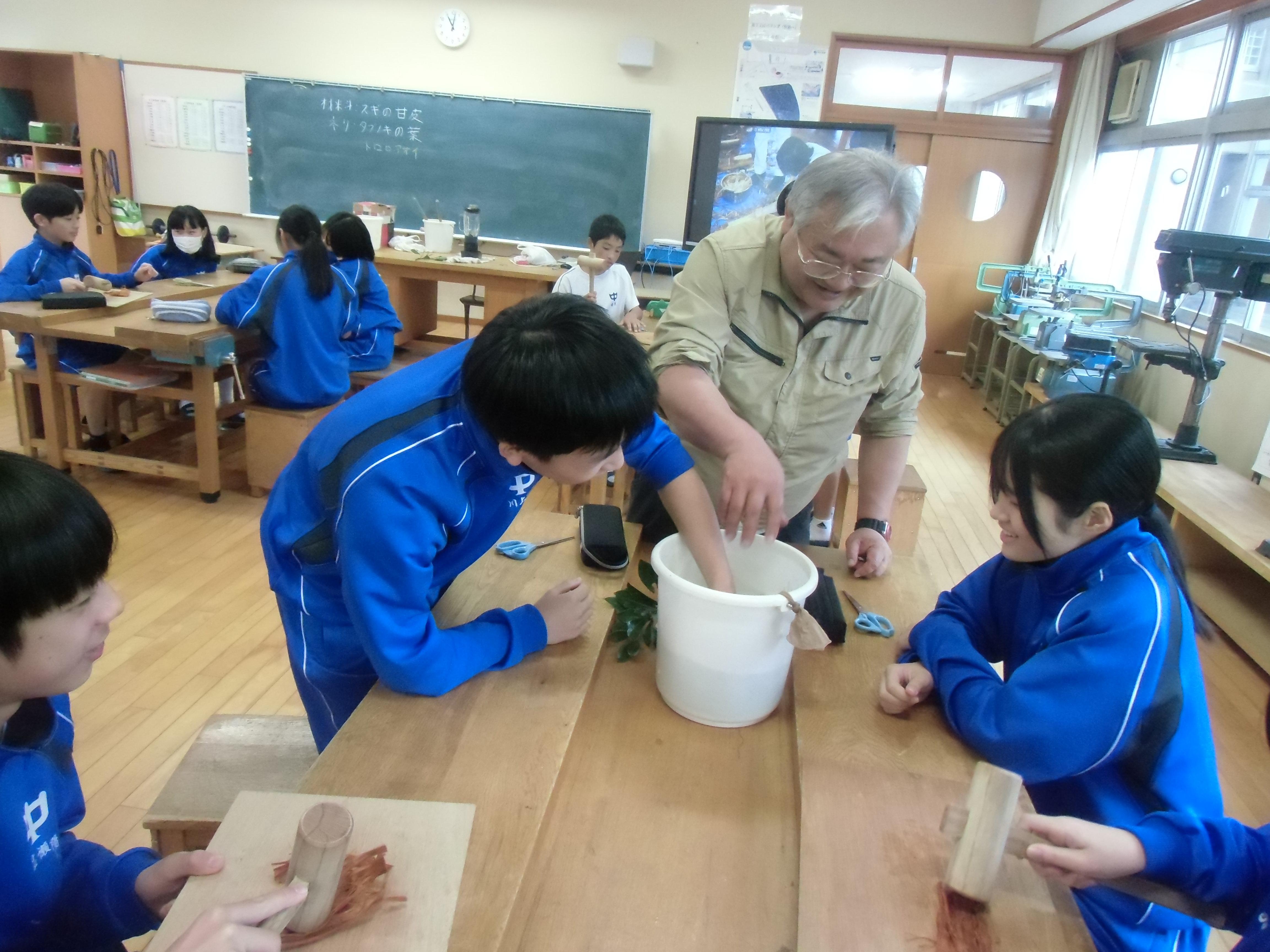 11/13(木)1年生が、森林環境教育の出前講座を受けました。もちろん林業のお話を聞きましたが、体験活動は木の繊維を使って紙をつくるというもの。接着剤の役割を果たす樹皮をミキサーにかけ、その樹液を採る過程と、紙となる樹皮を細かく砕き、接着剤となる樹皮と合わせてアイロンがけをし紙にするというもの。なかなかできる体験ではありません。