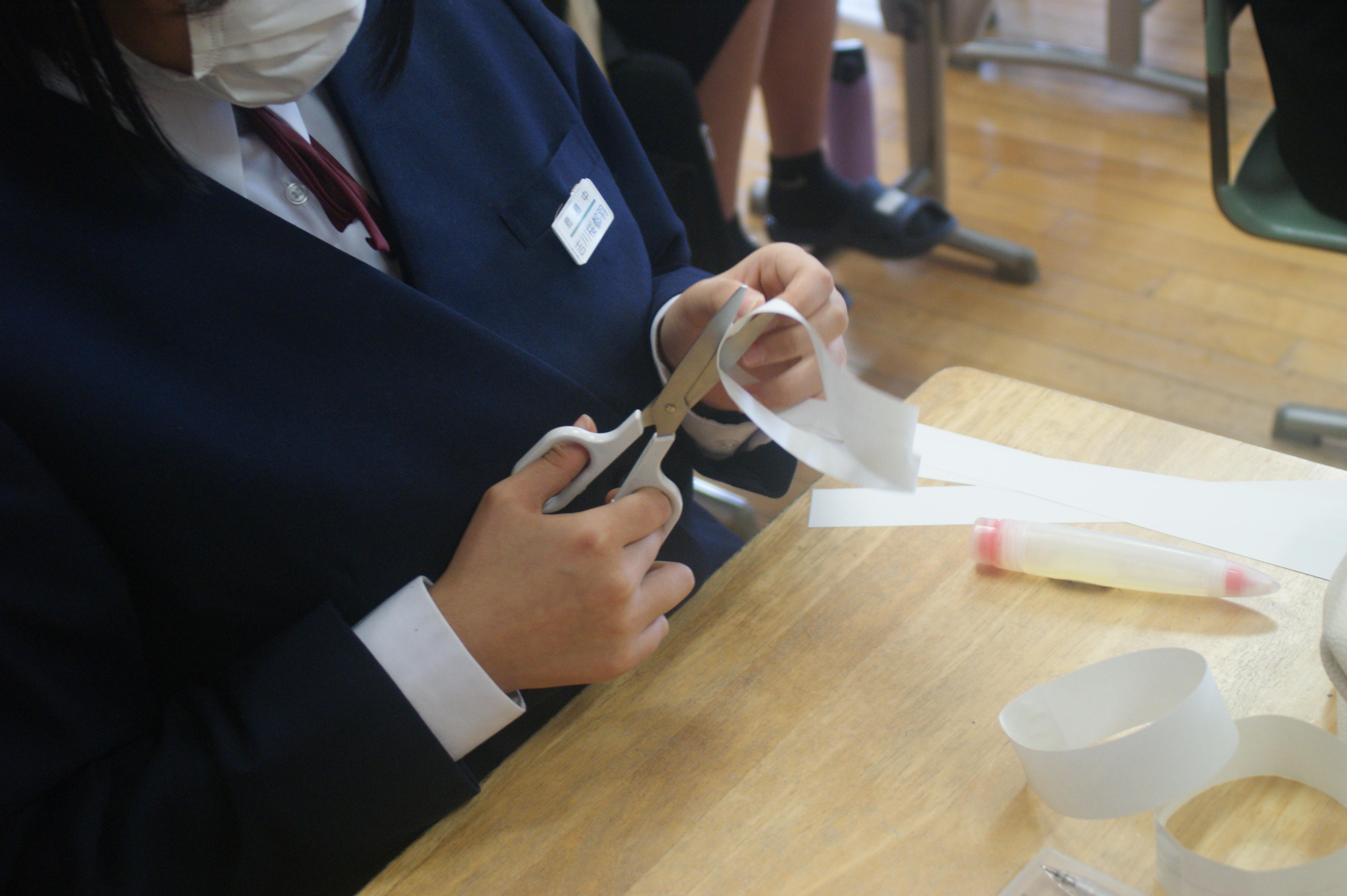 1年生教室をのぞくと、何やら紙を使って数学の授業。校長先生もどうぞということで、授業に参加しました。「メビウスの輪」これも数学!紙を繋いで線を引き、それを切っていくと、その結果にびっくりすることばかり。???の連続に、知的好奇心をくすぐられ、あっという間の1時間でした。1年生も時に集中、時に楽しく、良い雰囲気の中での授業を共有させてもらいました。また、改めて体が大きくなり、顔も大人びてきて、発言もしっかりしてきていることに気づき、4月からは素敵な先輩になってくれそうだと感じることしきりでした。