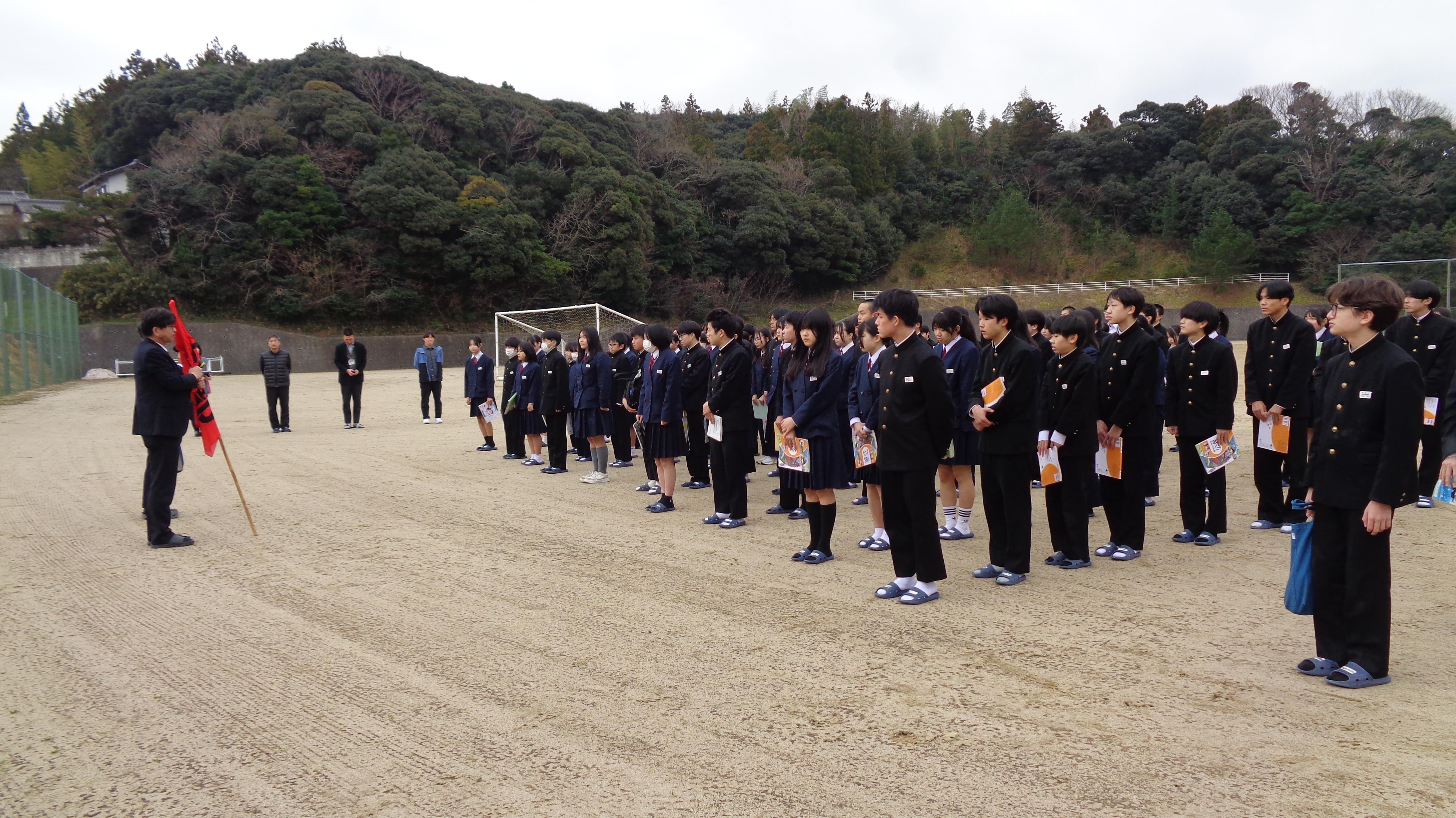 今日は6時間目終了後に地震の避難訓練をおこないました。まさに1月に地震を体験したばかりの生徒たち。部活動に参加していた生徒たちは、部活ごとに校庭に避難しました。家庭で過ごしていた3年生や、その日に部活動に来ていなかった1,2年生は、家庭でどのように避難したでしょうか。