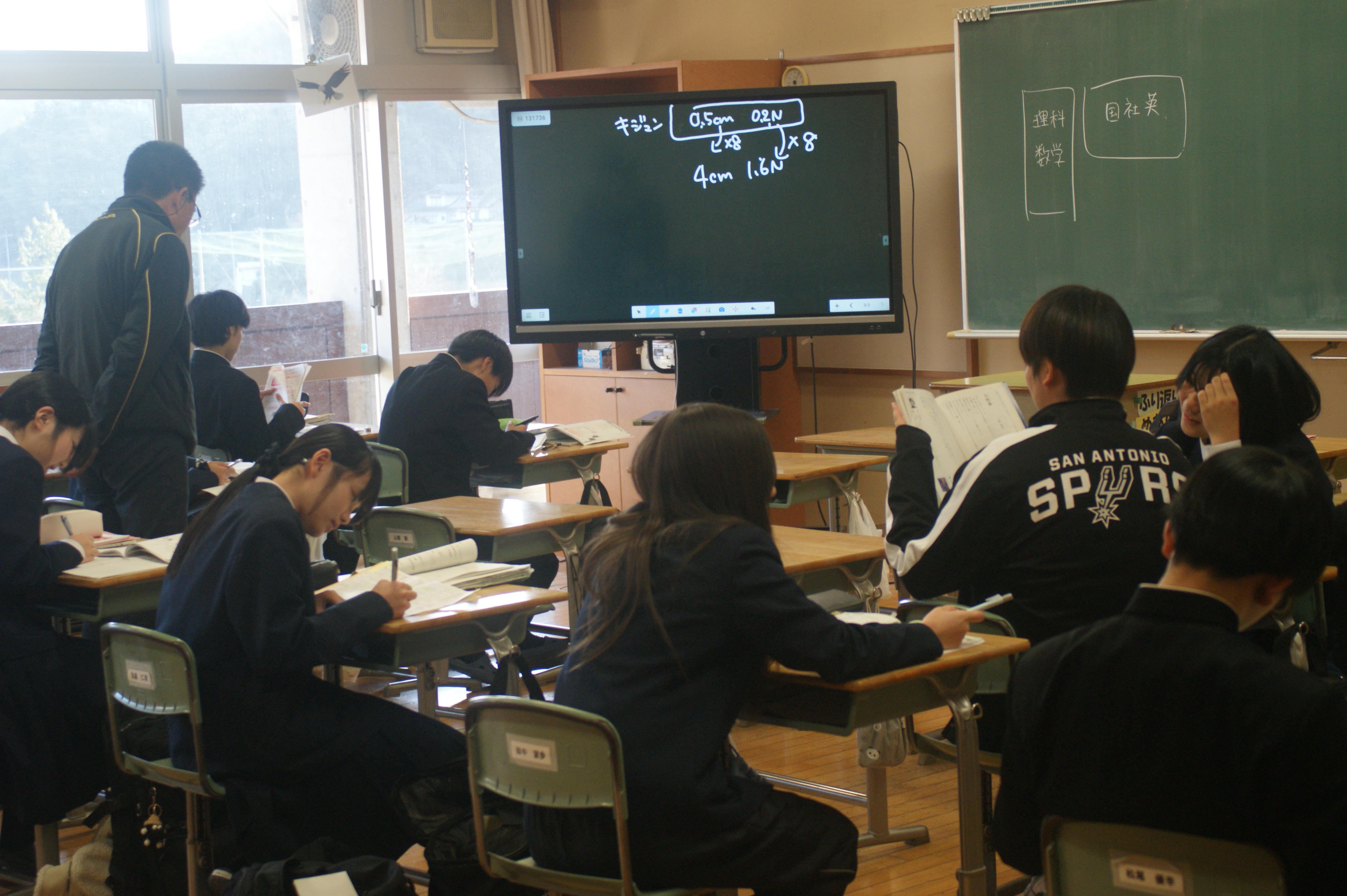 1、2年生は、今日から期末テスト前の部活動休止期間に入りました。放課後の教室をのぞいてみると、教科書やワークを広げ、テストに向けた学習に取り組む生徒たちの姿を見ることができました。また、3年生教室でも、受験に向けて頑張る生徒の姿もありました。