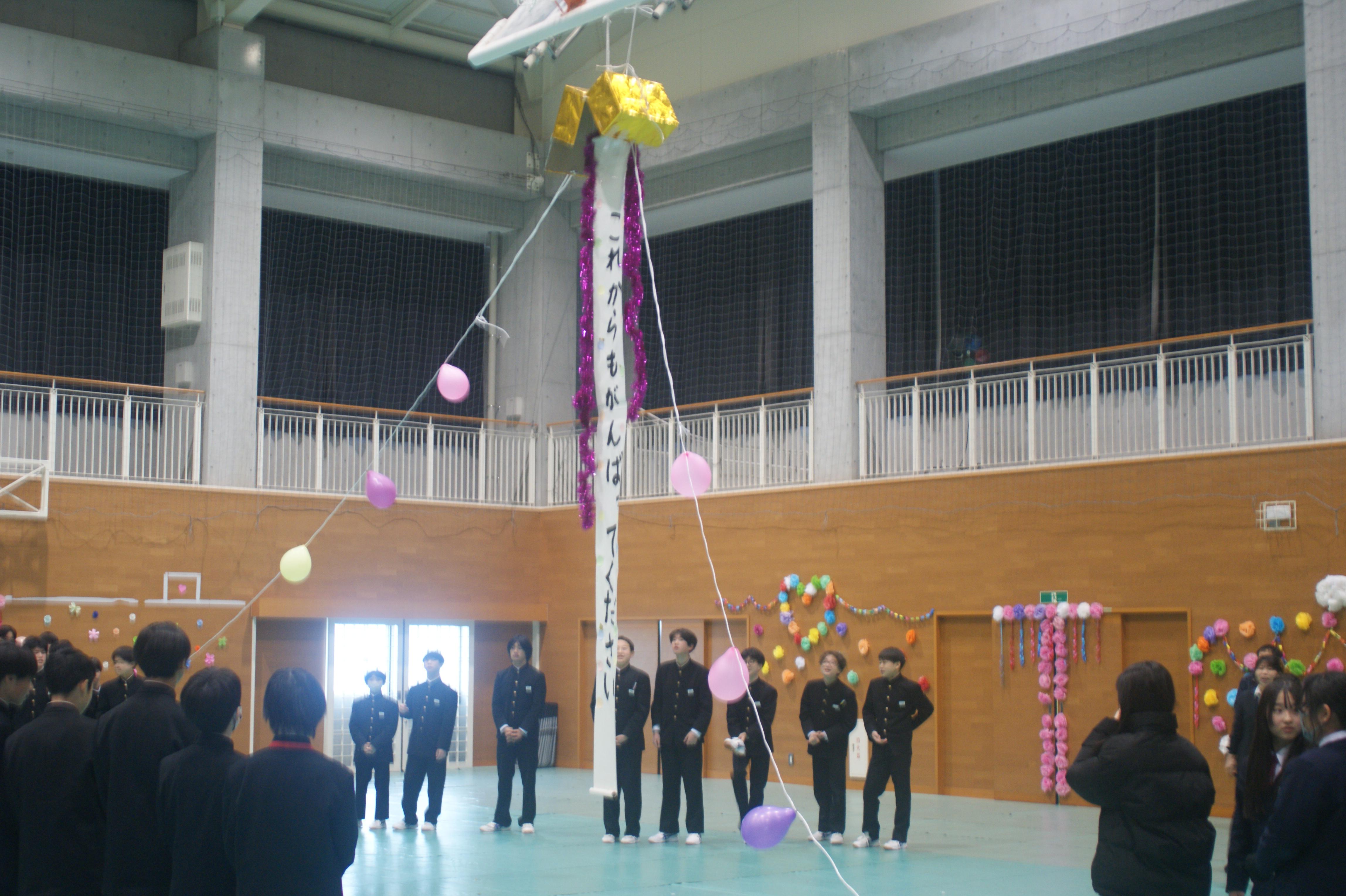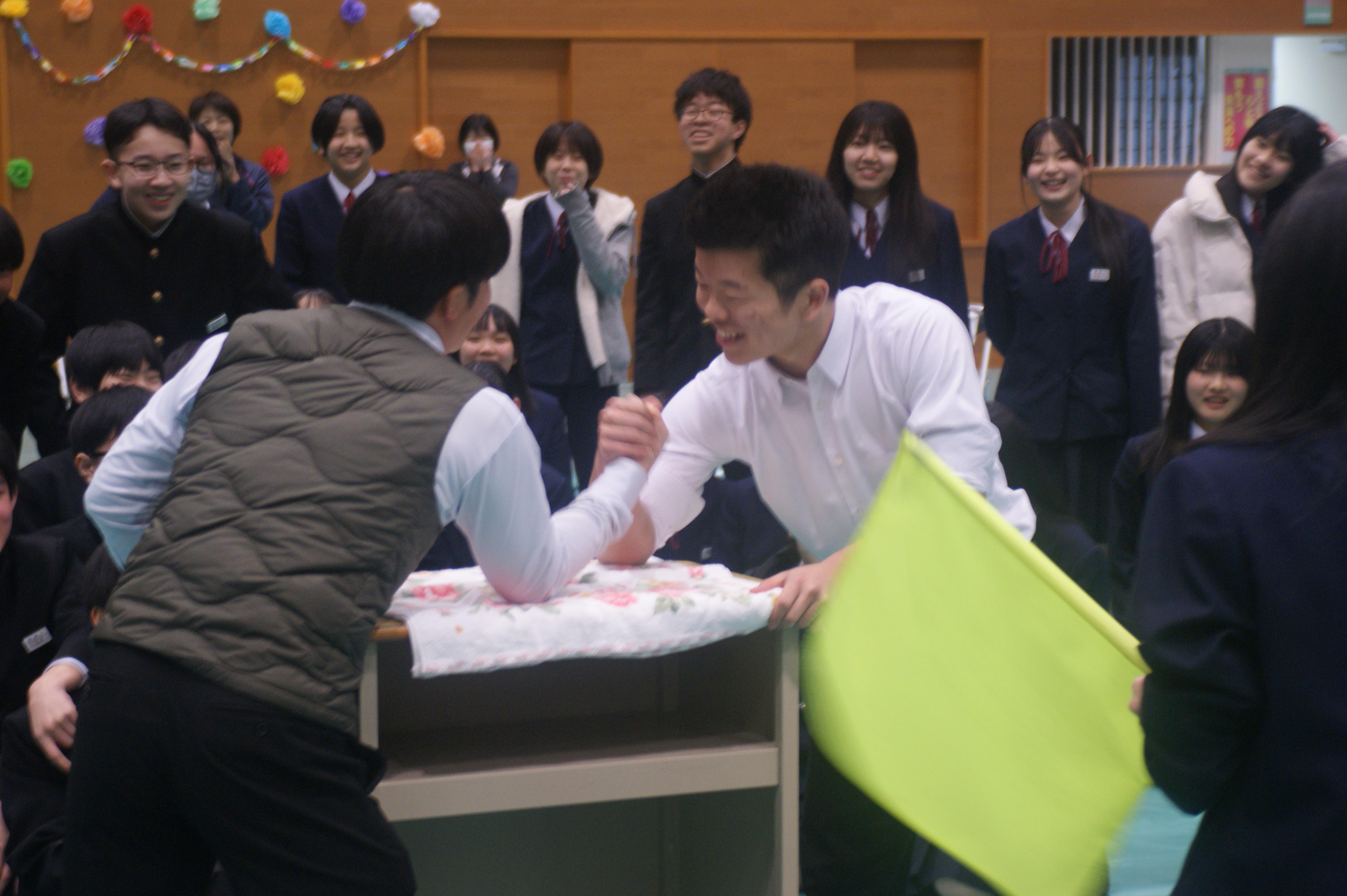4時間目は、2年生の新生徒会企画の3年生を送る会をおこないました。縦割りで班を作り、チーム戦で行うクイズ大会、途中、田中先生とのフラフープ対決、角田先生との腕相撲対決もクイズとなり、全校が大いに盛り上がりました。また、くす玉披露、在校生から歌のプレゼント、お世話になった先生方からのメッセージなど、今年の鹿島中の成長の集大成となる、みんな一緒に!みんなで楽しむ!を実感できる時間でしたし、鹿中の温かさを改めて感じる時間でもありました。