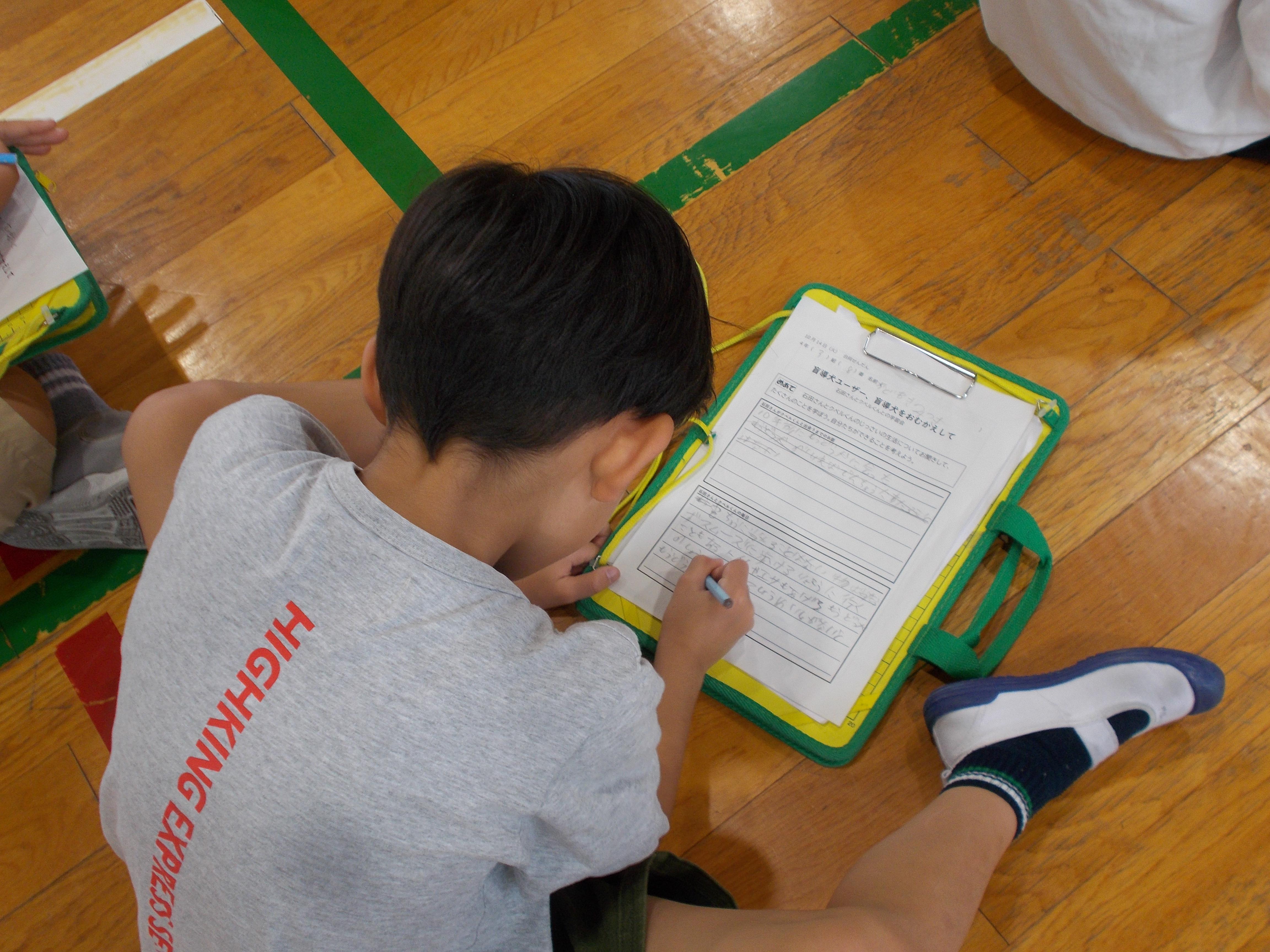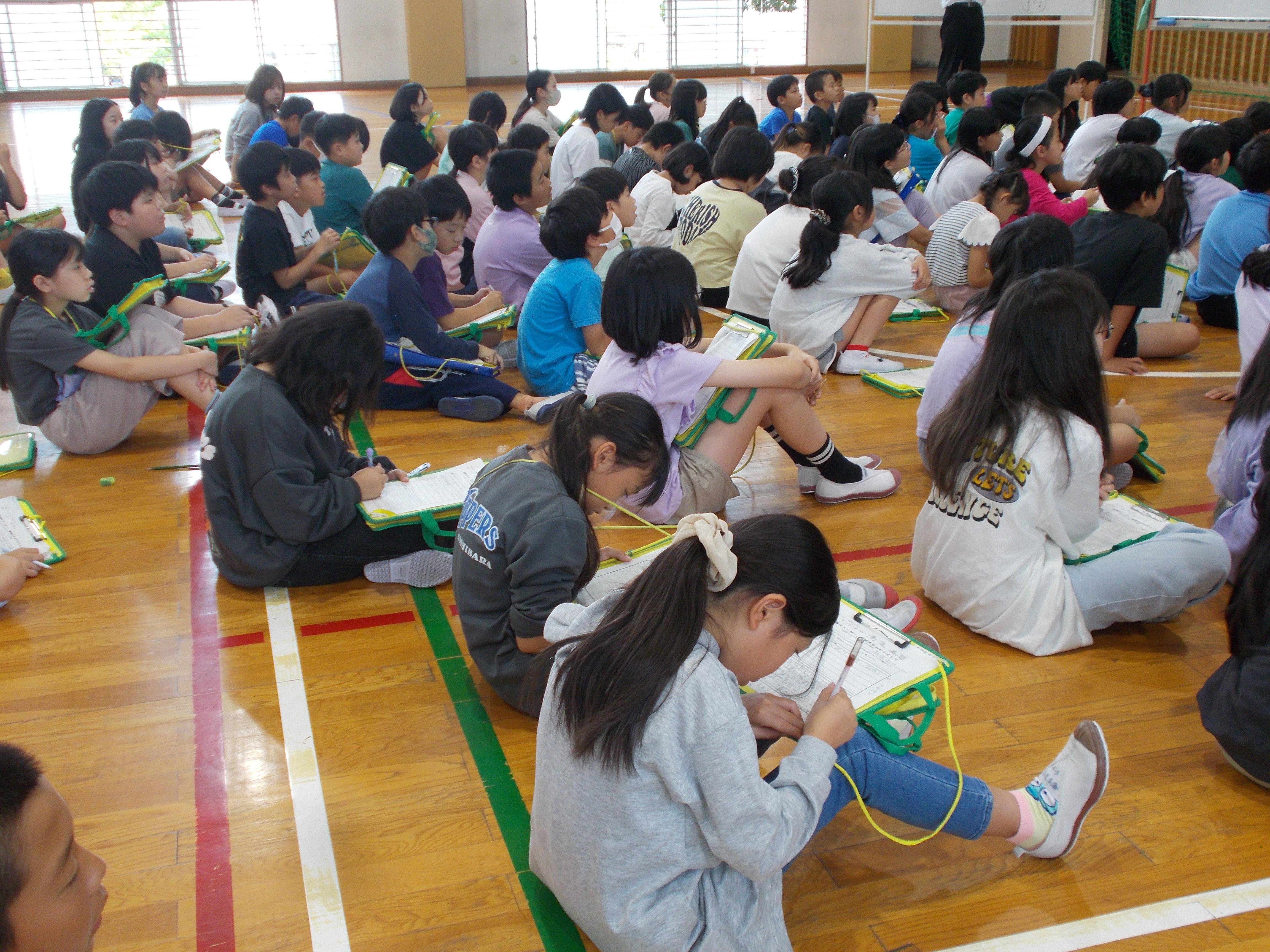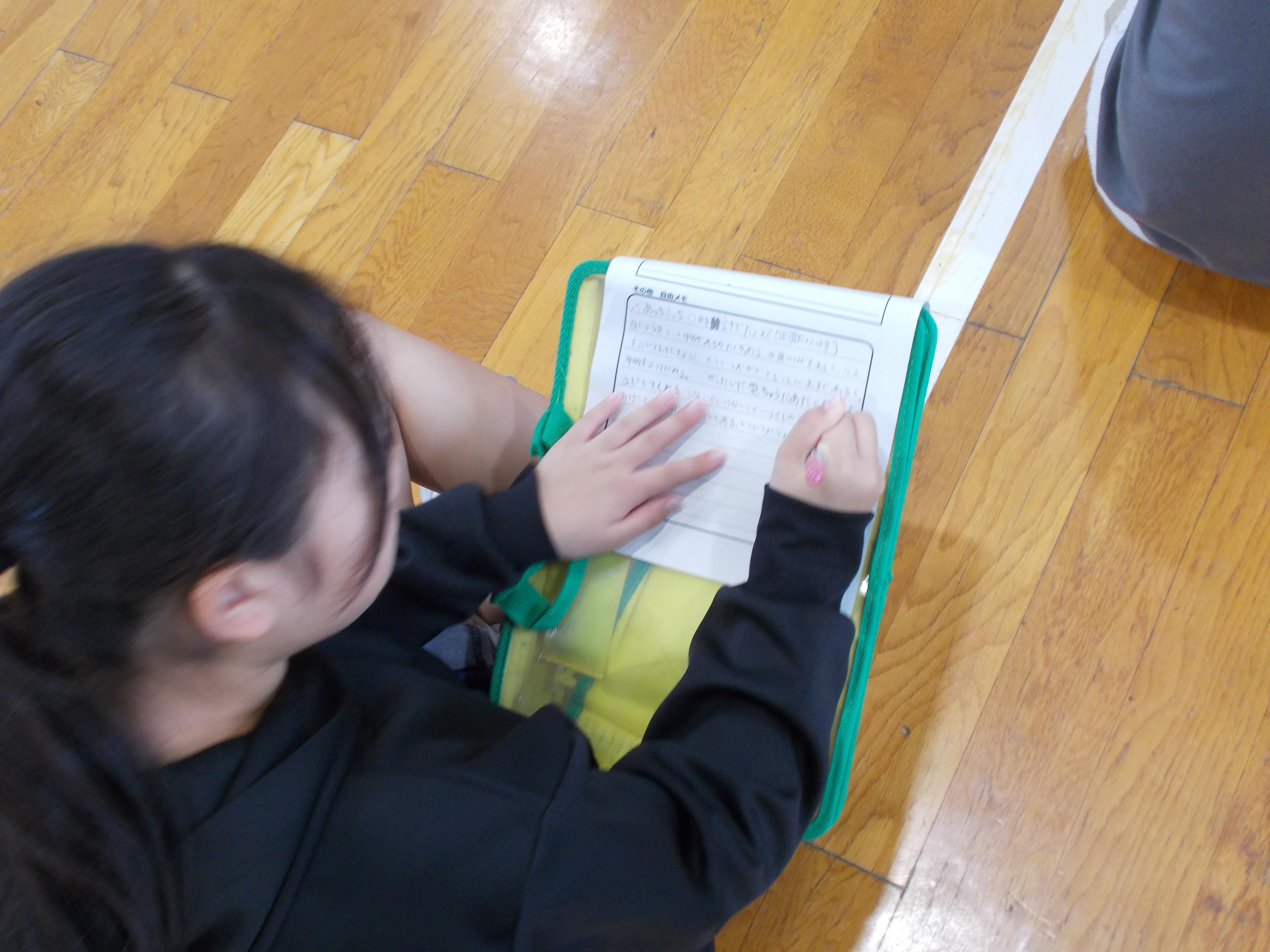 4年生の児童は、石田様のお話、白杖や盲導犬のクベルくんの動きなど気づいたことをメモ用紙いっぱいに書き込んでいました。「ぜひ、みんなには困っている人を見つけたら、『思いやりの心』をもって、自分にできることはないかな?と考えてほしい。」とお話いただきました。きっと石田様のお話は4年生の心にしっかりと届いていると思います。壁をなくし、みんなが幸せに暮らせる世の中をつくることができるように、4年生はこれからも福祉についてたくさん学んでほしいと思います。