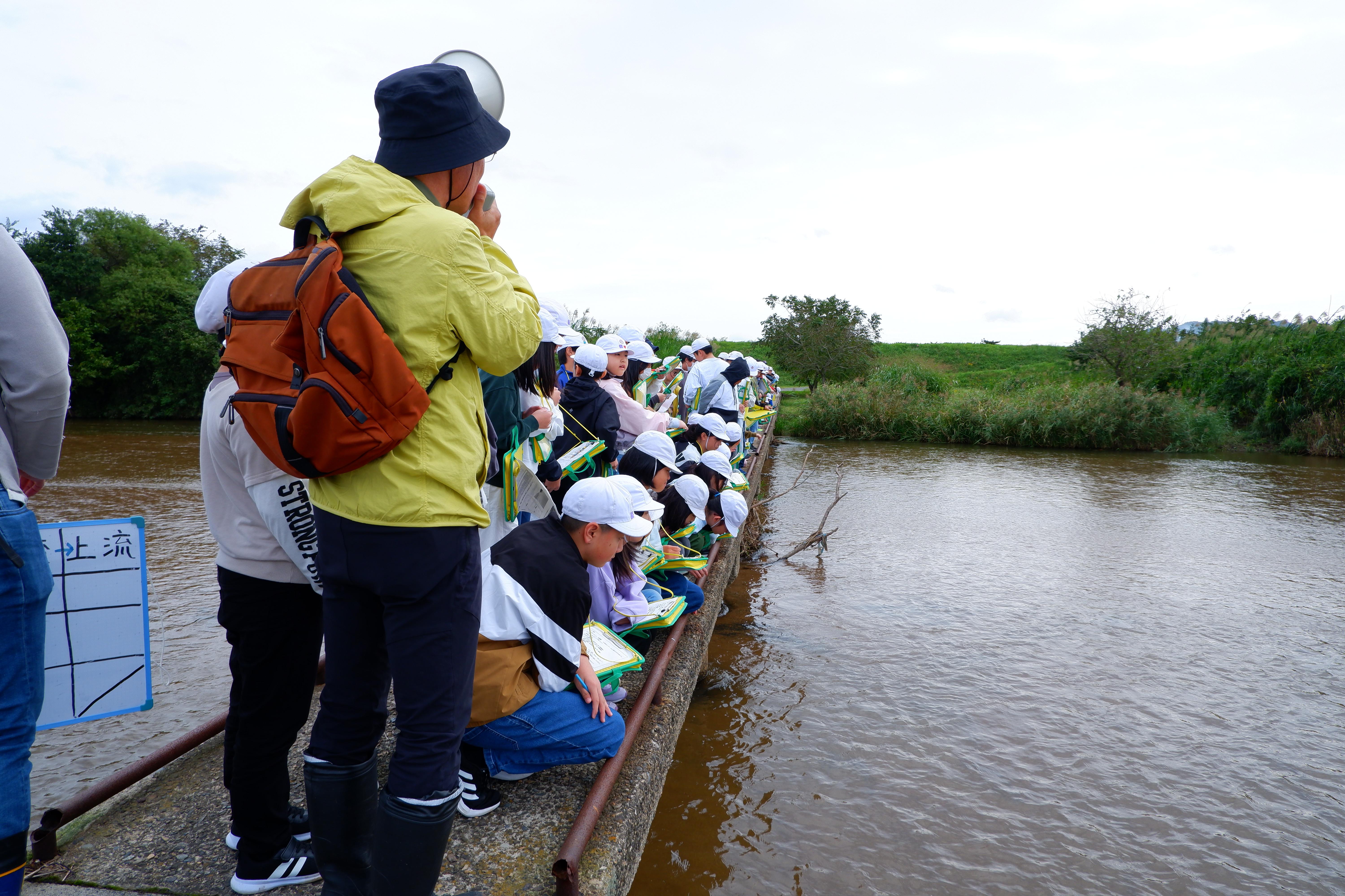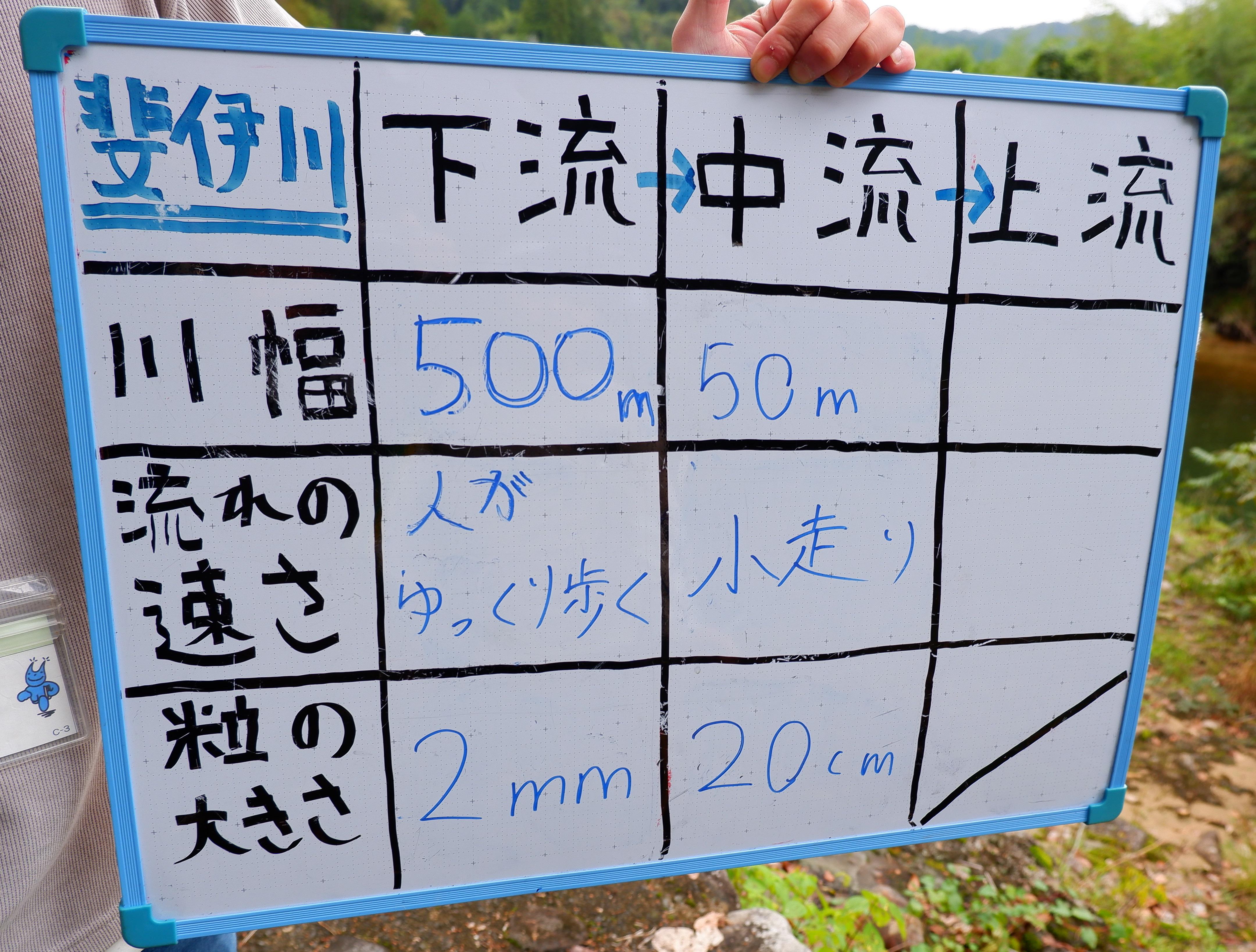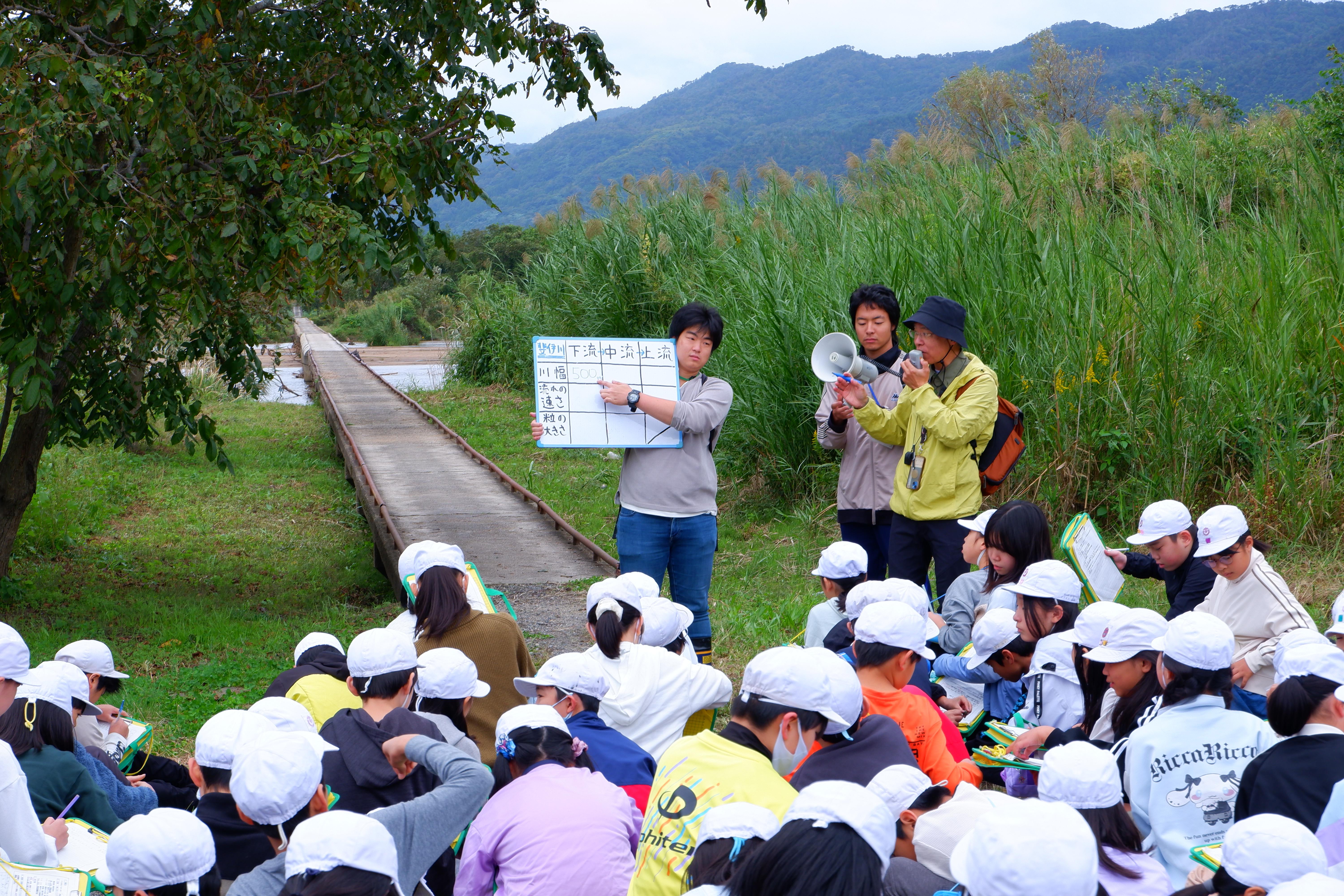 本日、5年生は理科「流れる水のはたらき」の学習で斐伊川に行きました。斐伊川の源流から河口までの川の流れや石の観察や実験を行い、川の様子を見ました。この学習にあたり、島根大学 松本一郎先生にお越しいただき、5年生のこども達に川を見ながら説明をしていただきました。 斐伊川の下流、中流、上流の川幅や流れの速さ、粒の大きさなどに注目しながら見たり感じたことを記録し、それぞれの場所における大きな違いを感じながら、安全に気をつけて意欲的に学習することができました。