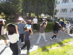 今日の避難訓練の様子を見ていると、授業途中ではありましたが、すぐに手を止めて静かに放送を聞き、担任の先生の指示のもと頭部を教科書等で守りながら避難をすることができました。「お・は・し・も」を全て守ることができ、特に今日は『しゃべらない」』ということがすごく良かったと思います。『しゃべらない」』ことで指示をしっかりと聞き、慌てることなくどう行動したら自分の命を守ることができるのか知ることができます。今日はそういったことができたからこそ、迅速な避難に繋がったのではないかと思います。