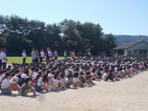 「地震が発生した際に、緊急放送を正確に聞き取り、「お・は・し・も」の約束を守って、速やかに避難場所に避難できるようにする。」ことを目的にして実施しました。