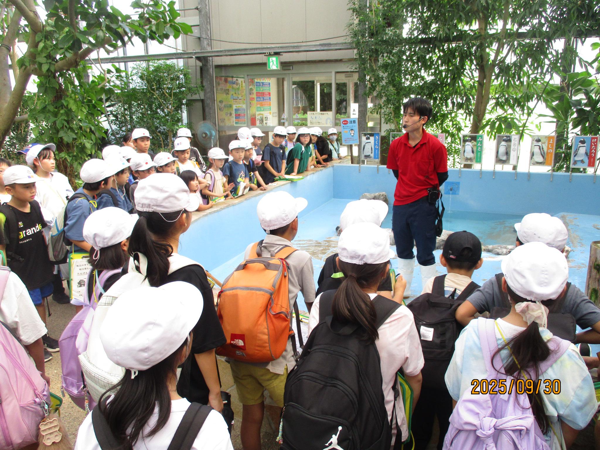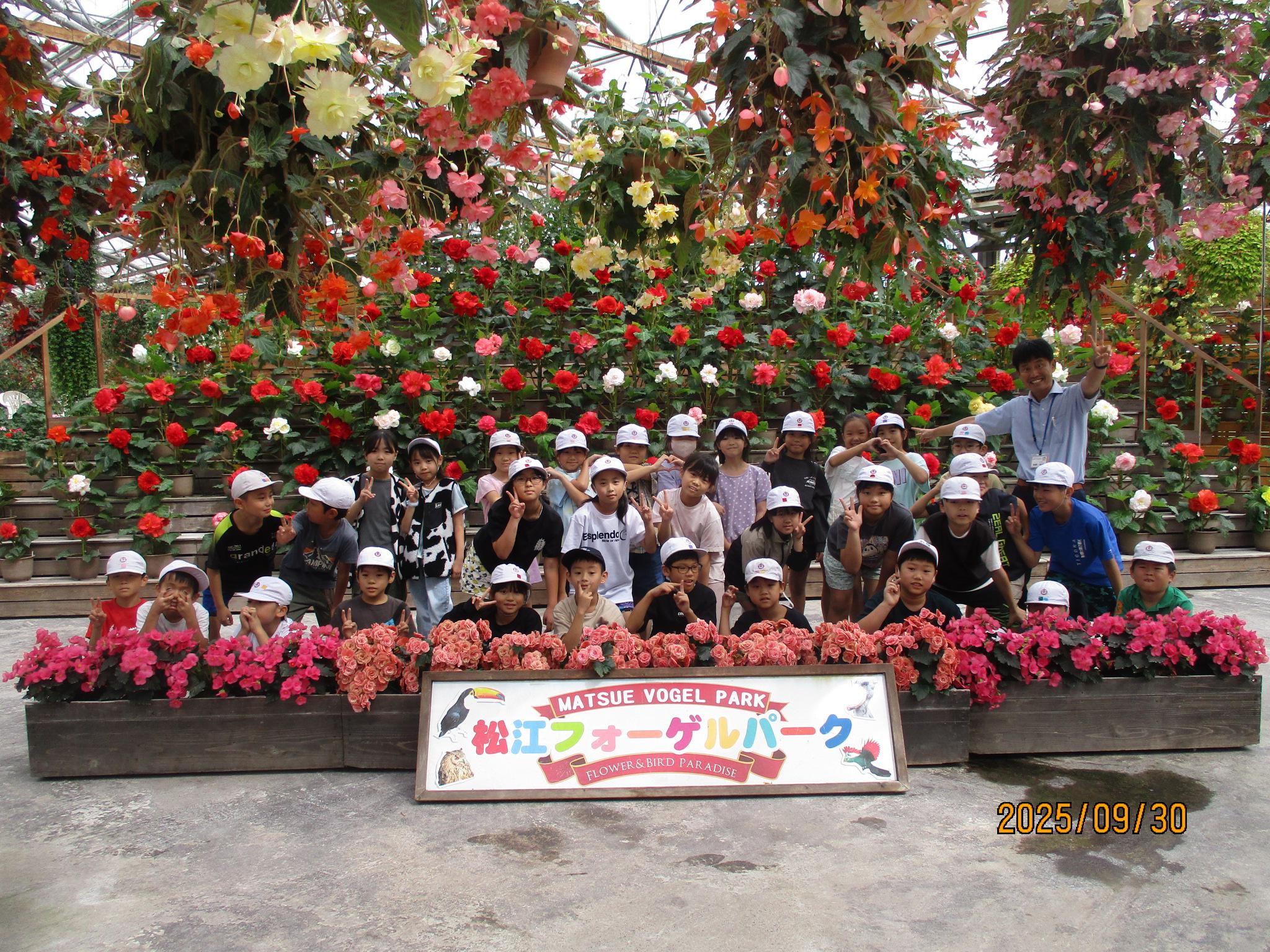 9月30日(火)松江って素敵だな 2025年09月30日 本日、3年生は松江市探検で松江城と松江フォーゲルパークに出かけました。 松江城では天守閣から松江市を眺め、天守閣を絵に描きました。午後にはフォーゲルパークの魅力を探して歩きました。どちらも松江の名所であったり歴史ある観光スポットのため、3年生は魅力を感じながら楽しく1日を過ごすことができました。校外活動に出かけて本物を見たり、触れたりすることでこども達は多くのことを感じたことと思います。1学期から古志原や松江の魅力を探してきましたが、この感じたことを大切にしてほしいと思います。