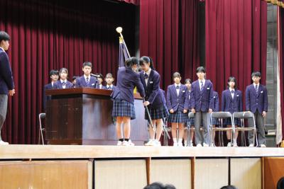 第32期生徒会会長から、第33期生徒会会長へ校旗が手渡されバトンタッチ。