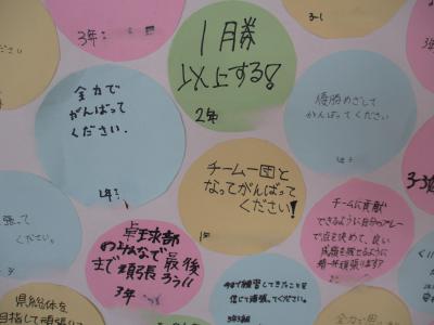 先日のブロック大会の壮行式で披露されたメッセージカード。書く方はそれほど負担ではなかったかもしれませんが、貼る方は本当にたいへんだったと思います。ふれあいホールに誰でも見えるように掲示されました。選手は壮行式に引き続き、応援されているという実感が出たでしょうか。これから本番までは調整になると思われますが、本番でベストのパフォーマンスを発揮できるのも才能です。しっかり寝てるなどして体調を整えてほしいと思います。