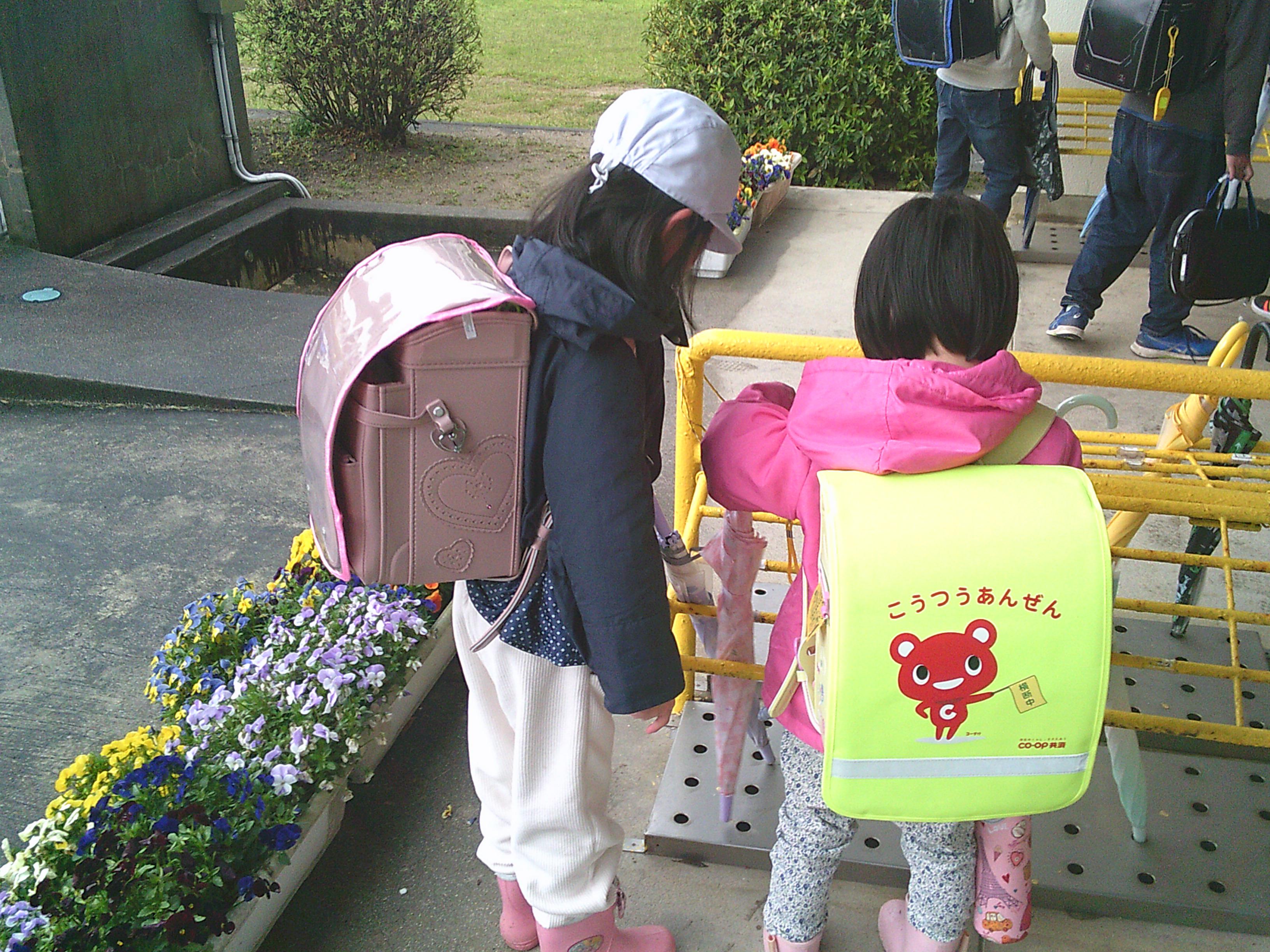校門では民生児童委員の皆様による「あいさつ運動」が行われ、こどもたちの元気な声が朝の空気に響きました。昇降口では、2年生が1年生に傘の置き方を優しく教える微笑ましい場面も見られました。