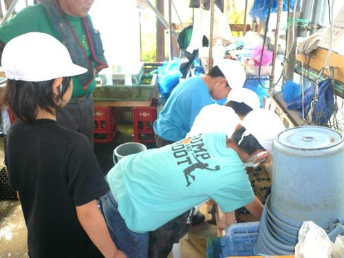 漁を終えた後は、1・2年生と合流し、しじみの選別体験や生き物観察をしました。