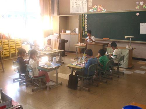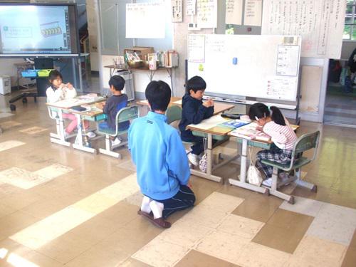 これは、湖北中学校で実施されている職場体験実習の一環で、2名の生徒は熱心に学習や活動のサポートをしたり、給食や休み時間を一緒に過ごしたりして、小学生と楽しく交流していました。
