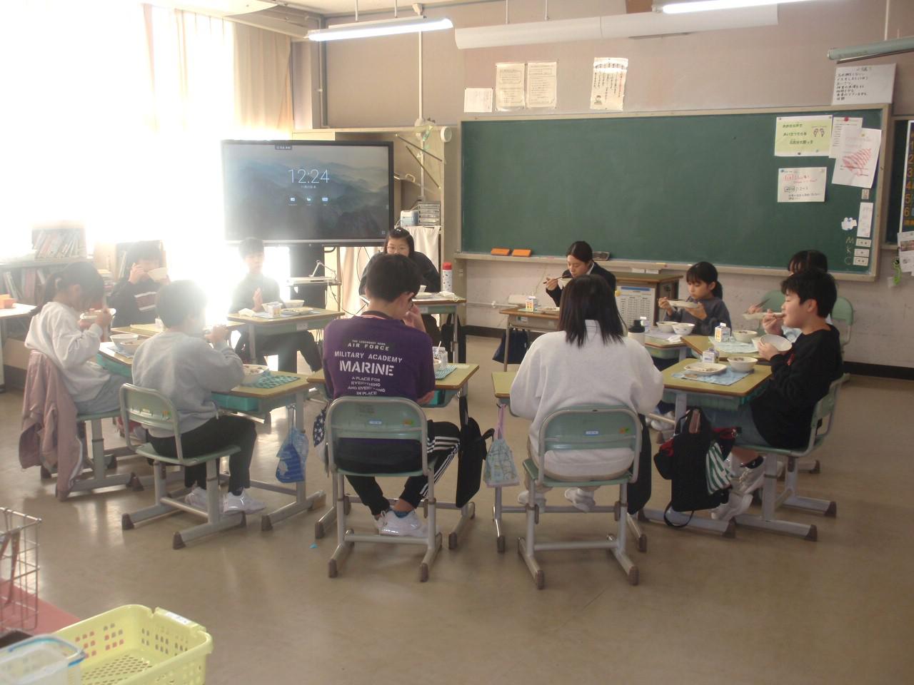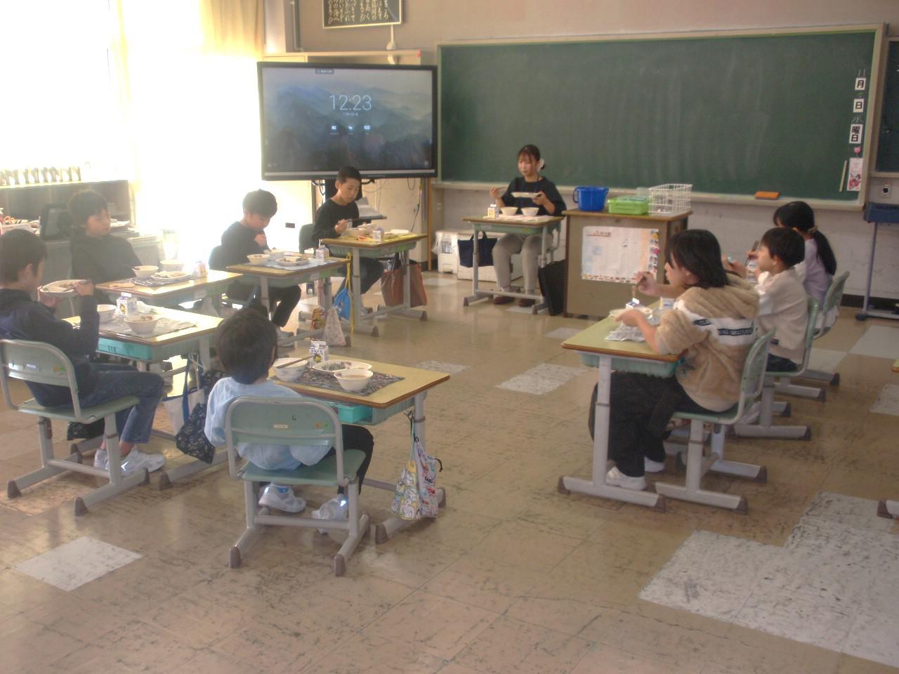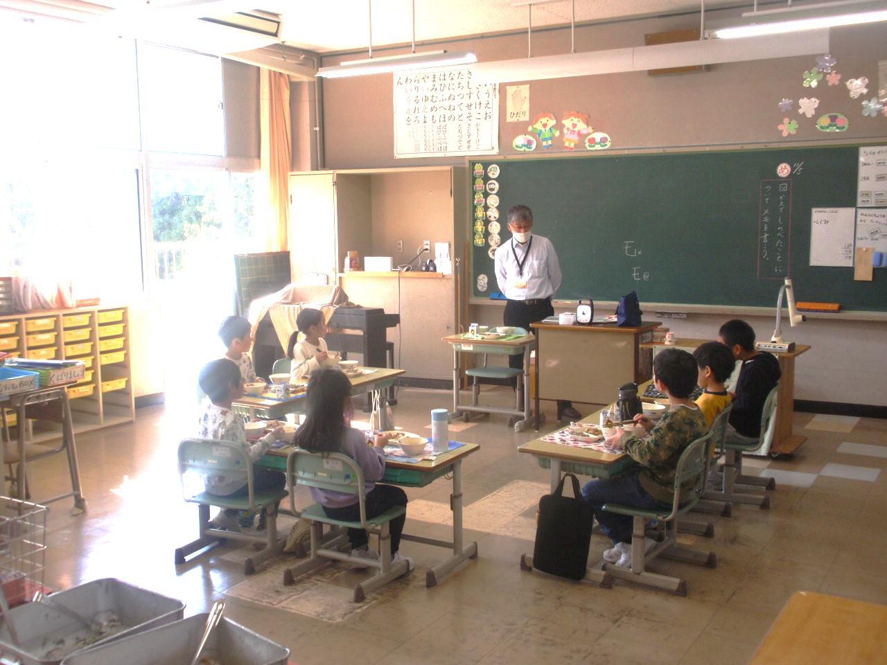 11月5日、給食センターから3名の職員の方が来校され、各学級でこどもたちと一緒に給食を食べ、交流しました。