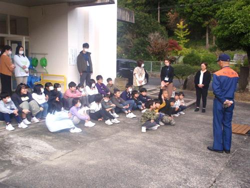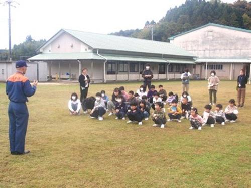 地震発生を想定し、こどもたちは机の下に身を隠した後、安全を確認して速やかに校庭に避難しました。