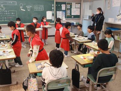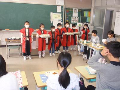 さらに、給食の時間には、1・2年生が自分たちで作ったポップコーンを全校のみんなに配りました。受け取った児童からは「おいしそう!」「ありがとう!」という声があがり、温かい気持ちが学校全体に広がりました。