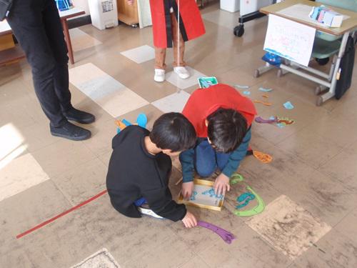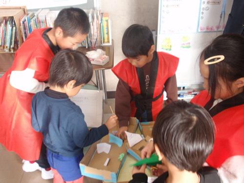 まずは、1・2年生の教室で交流スタートです。先日の秋祭りと同じく、迫力ある「太鼓の演奏」と手作りの「遊びの屋台」でおもてなし。園児さんに楽しんでもらおうと、1・2年生も張り切っていました。