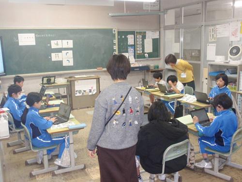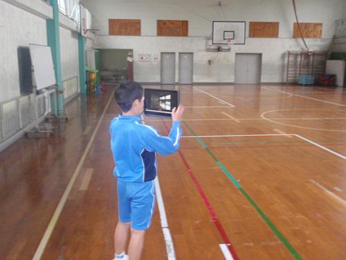 今日は、各自が校内を回って道案内のヒントになる場所をタブレットで撮影。その写真をもとに、学習用ソフトを使ってクイズを構成する段階まで進みました。
